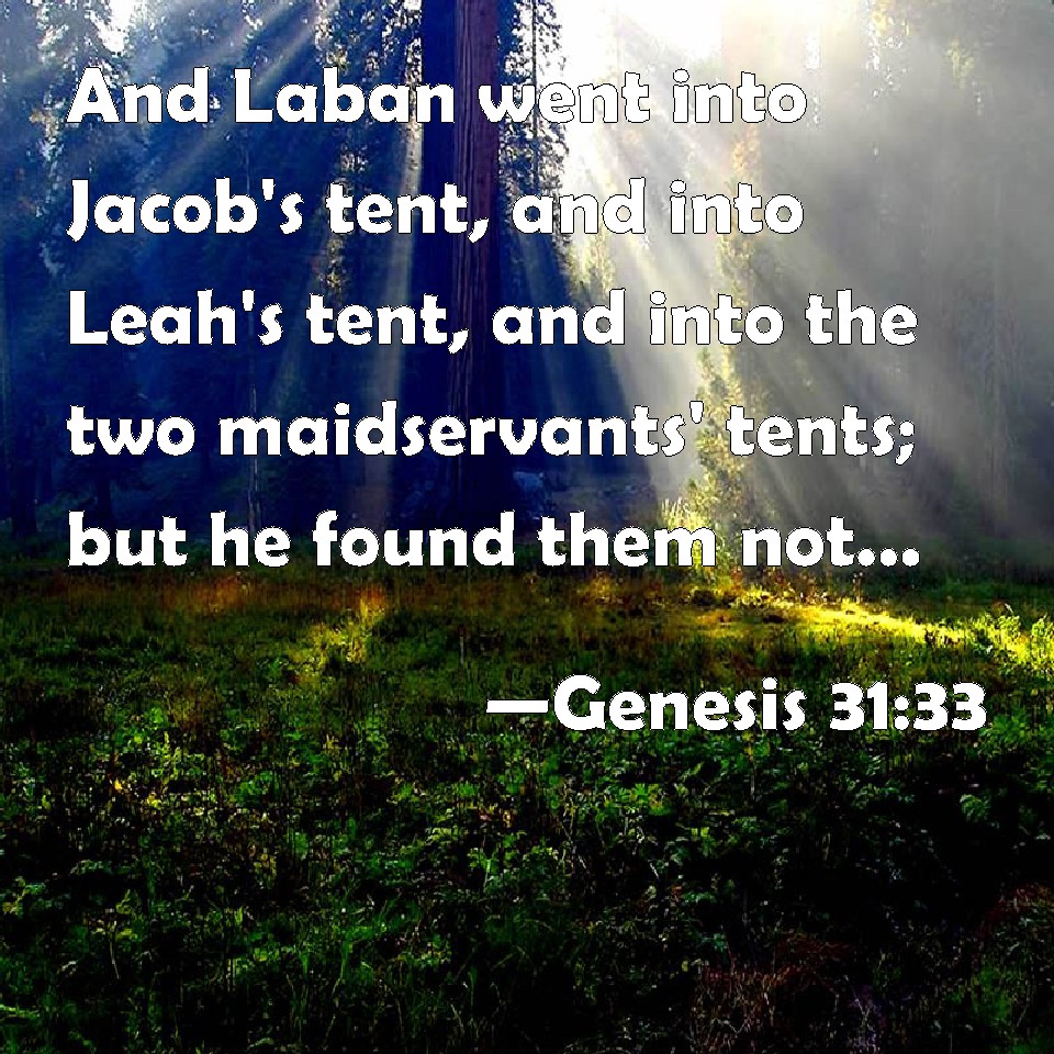 Choose a Background Genesis 31:33 And Laban went into Jacob's tent, and into Leah's tent, and into the two maidservants' tents; but he found them not. Then went he out of Leah's tent, and entered into Rachel's tent. KJV: And Laban went into Jacob's tent, and into Leah's tent, and into the two maidservants' tents; but he found them not. Then went he out of Leah's tent, and entered into Rachel's tent. DRB: So Laban went into the tent of Jacob, and of Lia, and of both the handmaids, and found them not. And when he was entered into Rachel's tent, DBT: And Laban went into Jacob's tent, and into Leah's tent, and into the two handmaids' tents, and found nothing; and he went out of Leah's tent, and entered into Rachel's tent. ERV: And Laban went into Jacob's tent, and into Leah's tent, and into the tent of the two maidservants; but he found them not. And he went out of Leah's tent, and entered into Rachel's tent. WBT: And Laban went into Jacob's tent, and into Leah's tent, and into the two maid-servants' tents; but he found them not. Then he went out of Leah's tent, and entered into Rachel's tent. WEB: Laban went into Jacob's tent, into Leah's tent, and into the tent of the two female servants; but he didn't find them. He went out of Leah's tent, and entered into Rachel's tent. YLT: And Laban goeth into the tent of Jacob, and into the tent of Leah, and into the tent of the two handmaidens, and hath not found; and he goeth out from the tent of Leah, and goeth into the tent of Rachel.Links Genesis 31:33 NIV • Genesis 31:33 NLT • Genesis 31:33 ESV • Genesis 31:33 NASB • Genesis 31:33 KJV • Genesis 31:33 Interlinear • Genesis 31:33 Commentaries • Genesis 31:33 Parallel Texts • Genesis 31:33 Bible Apps • Genesis 31:33 Parallel • Bible Hub |