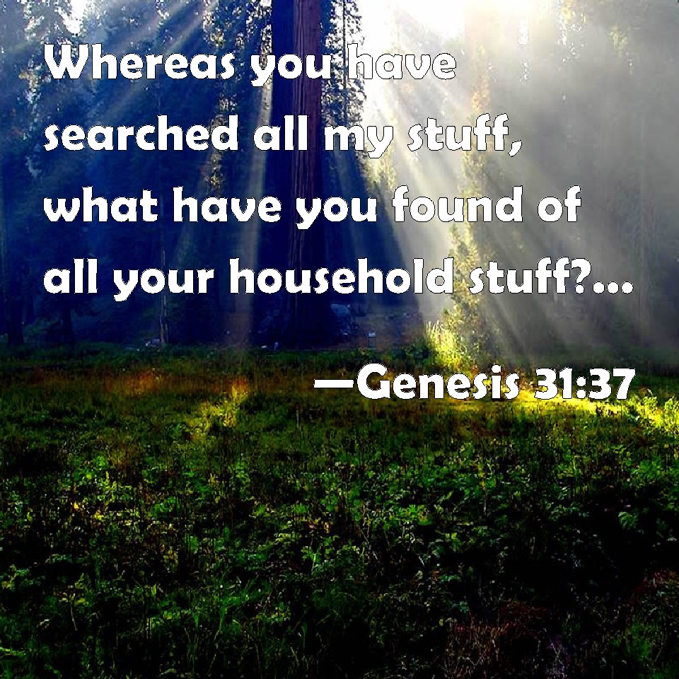 Choose a Background Genesis 31:37 Whereas you have searched all my stuff, what have you found of all your household stuff? set it here before my brothers and your brothers, that they may judge between us both. KJV: Whereas thou hast searched all my stuff, what hast thou found of all thy household stuff? set it here before my brethren and thy brethren, that they may judge betwixt us both. DRB: And searched all my household stuff? What hast thou found of all the substance of thy house? lay it here before my brethren, and thy brethren, and let them judge between me and thee. DBT: Whereas thou hast explored all my baggage, what hast thou found of all thy household stuff? Set it here before my brethren and thy brethren, and let them decide between us both. ERV: Whereas thou hast felt about all my stuff, what hast thou found of all thy household stuff? Set it here before my brethren and thy brethren, that they may judge betwixt us two. WBT: Whereas thou hast searched all my stuff, what hast thou found of all thy household-stuff? set it here before my brethren, and thy brethren, that they may judge betwixt us both. WEB: Now that you have felt around in all my stuff, what have you found of all your household stuff? Set it here before my relatives and your relatives, that they may judge between us two. YLT: for thou hast felt all my vessels: what hast thou found of all the vessels of thy house? set here before my brethren, and thy brethren, and they decide between us both.Links Genesis 31:37 NIV • Genesis 31:37 NLT • Genesis 31:37 ESV • Genesis 31:37 NASB • Genesis 31:37 KJV • Genesis 31:37 Interlinear • Genesis 31:37 Commentaries • Genesis 31:37 Parallel Texts • Genesis 31:37 Bible Apps • Genesis 31:37 Parallel • Bible Hub |