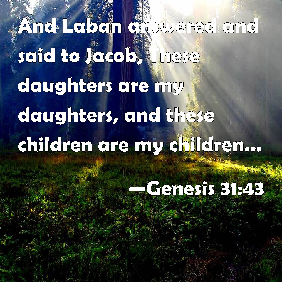 Choose a Background Genesis 31:43 And Laban answered and said to Jacob, These daughters are my daughters, and these children are my children, and these cattle are my cattle, and all that you see is mine: and what can I do this day to these my daughters, or to their children which they have born? KJV: And Laban answered and said unto Jacob, These daughters are my daughters, and these children are my children, and these cattle are my cattle, and all that thou seest is mine: and what can I do this day unto these my daughters, or unto their children which they have born? DRB: Laban answered him: The daughters are mine and the children, and thy flocks, and all things that thou seest are mine: what can I do to my children, and grandchildren? DBT: And Laban answered and said to Jacob, The daughters are my daughters, and the sons are my sons, and the flock is my flock, and all that thou seest is mine; but as for my daughters, what can I do this day to them, or to their sons whom they have brought forth? ERV: And Laban answered and said unto Jacob, The daughters are my daughters, and the children are my children, and the flocks are my flocks, and all that thou seest is mine: and what can I do this day unto these my daughters, or unto their children which they have borne? WBT: And Laban answered, and said to Jacob, These daughters are my daughters, and these children are my children, and these cattle are my cattle, and all that thou seest is mine; and what can I do this day to these my daughters, or to their children which they have borne? WEB: Laban answered Jacob, "The daughters are my daughters, the children are my children, the flocks are my flocks, and all that you see is mine: and what can I do this day to these my daughters, or to their children whom they have borne? YLT: And Laban answereth and saith unto Jacob, 'The daughters are my daughters, and the sons my sons, and the flock my flock, and all that thou art seeing is mine; and to my daughters — what do I to these to-day, or to their sons whom they have born?Links Genesis 31:43 NIV • Genesis 31:43 NLT • Genesis 31:43 ESV • Genesis 31:43 NASB • Genesis 31:43 KJV • Genesis 31:43 Interlinear • Genesis 31:43 Commentaries • Genesis 31:43 Parallel Texts • Genesis 31:43 Bible Apps • Genesis 31:43 Parallel • Bible Hub |