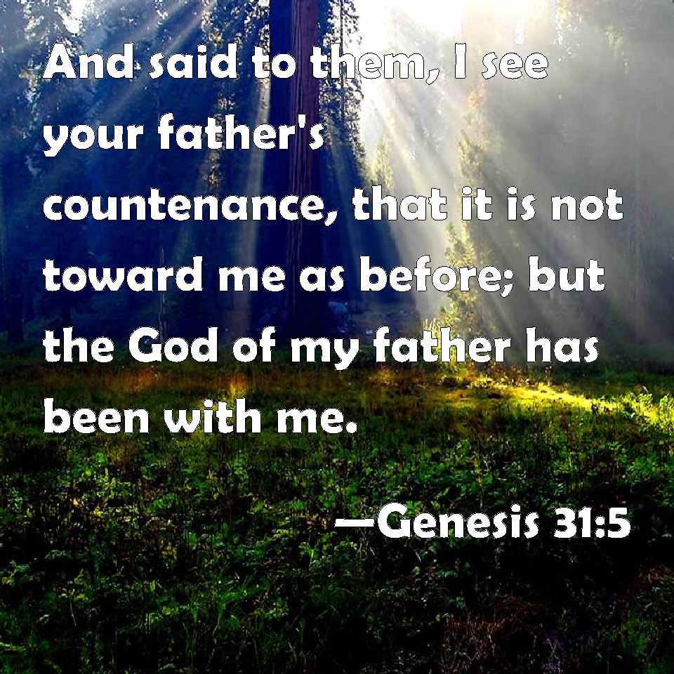 Choose a Background Genesis 31:5 And said to them, I see your father's countenance, that it is not toward me as before; but the God of my father has been with me. KJV: And said unto them, I see your father's countenance, that it is not toward me as before; but the God of my father hath been with me. DRB: And said to them: I see your father's countenance is not towards me as yesterday and the other day: but the God of my father hath been with me. DBT: and said to them, I see your father's countenance, that it is not toward me as previously; but the God of my father has been with me. ERV: and said unto them, I see your father's countenance, that it is not toward me as beforetime; but the God of my father hath been with me. WBT: And said to them, I see your father's countenance, that it is not towards me as before: but the God of my father hath been with me. WEB: and said to them, "I see the expression on your father's face, that it is not toward me as before; but the God of my father has been with me. YLT: and saith to them, 'I am beholding your father's face — that it is not towards me as heretofore, and the God of my father hath been with me,Links Genesis 31:5 NIV • Genesis 31:5 NLT • Genesis 31:5 ESV • Genesis 31:5 NASB • Genesis 31:5 KJV • Genesis 31:5 Interlinear • Genesis 31:5 Commentaries • Genesis 31:5 Parallel Texts • Genesis 31:5 Bible Apps • Genesis 31:5 Parallel • Bible Hub |