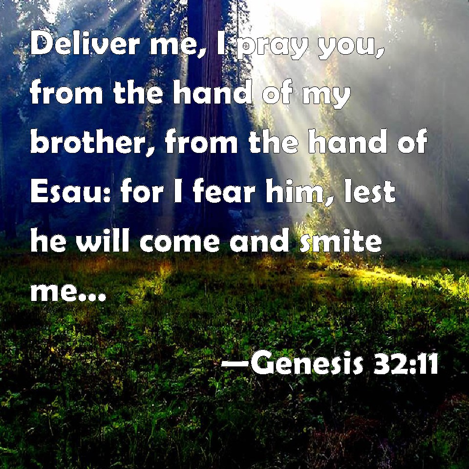 Choose a Background Genesis 32:11 Deliver me, I pray you, from the hand of my brother, from the hand of Esau: for I fear him, lest he will come and smite me, and the mother with the children. KJV: Deliver me, I pray thee, from the hand of my brother, from the hand of Esau: for I fear him, lest he will come and smite me, and the mother with the children. DRB: Deliver me from the hand of my brother Esau, for I am greatly afraid of him: lest perhaps he come, and kill the mother with the children. DBT: Deliver me, I pray thee, from the hand of my brother, from the hand of Esau; for I fear him, lest he come and smite me, and the mother with the children. ERV: Deliver me, I pray thee, from the hand of my brother, from the hand of Esau: for I fear him, lest he come and smite me, the mother with the children. WBT: Deliver me, I pray thee, from the hand of my brother, from the hand of Esau: for I fear him, lest he shall come and smite me, and the mother with the children. WEB: Please deliver me from the hand of my brother, from the hand of Esau: for I fear him, lest he come and strike me, and the mothers with the children. YLT: Deliver me, I pray Thee, from the hand of my brother, from the hand of Esau: for I am fearing him, less he come and have smitten me — mother beside sons;Links Genesis 32:11 NIV • Genesis 32:11 NLT • Genesis 32:11 ESV • Genesis 32:11 NASB • Genesis 32:11 KJV • Genesis 32:11 Interlinear • Genesis 32:11 Commentaries • Genesis 32:11 Parallel Texts • Genesis 32:11 Bible Apps • Genesis 32:11 Parallel • Bible Hub |