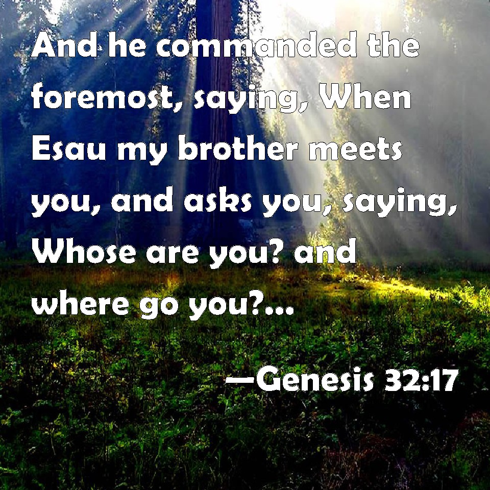 Choose a Background Genesis 32:17 And he commanded the foremost, saying, When Esau my brother meets you, and asks you, saying, Whose are you? and where go you? and whose are these before you? KJV: And he commanded the foremost, saying, When Esau my brother meeteth thee, and asketh thee, saying, Whose art thou? and whither goest thou? and whose are these before thee? DRB: And he commanded the first, saying: If thou meet my brother Esau, and he ask thee: Whose art thou? or whither goest thou? or whose are these before thee? DBT: And he commanded the foremost, saying, When Esau my brother meets thee, and asks thee, saying, Whose art thou, and where goest thou, and whose are these before thee? ERV: And he commanded the foremost, saying, When Esau my brother meeteth thee, and asketh thee, saying, Whose art thou? and whither goest thou? and whose are these before thee? WBT: And he commanded the foremost, saying, When Esau, my brother, meeteth thee, and asketh thee, saying, Whose art thou? and whither goest thou? and whose are these before thee? WEB: He commanded the foremost, saying, "When Esau, my brother, meets you, and asks you, saying, 'Whose are you? Where are you going? Whose are these before you?' YLT: And he commandeth the first, saying, 'When Esau my brother meeteth thee, and hath asked thee, saying, Whose art thou? and whither goest thou? and whose are these before thee?Links Genesis 32:17 NIV • Genesis 32:17 NLT • Genesis 32:17 ESV • Genesis 32:17 NASB • Genesis 32:17 KJV • Genesis 32:17 Interlinear • Genesis 32:17 Commentaries • Genesis 32:17 Parallel Texts • Genesis 32:17 Bible Apps • Genesis 32:17 Parallel • Bible Hub |