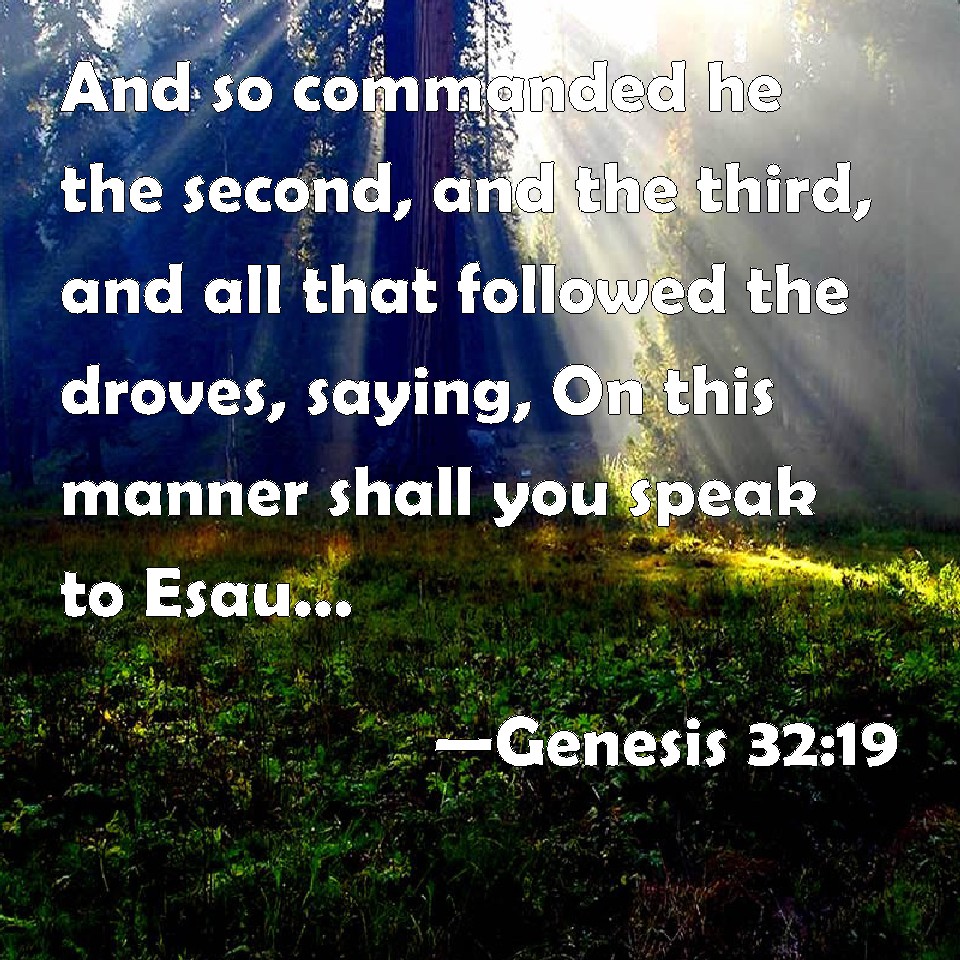 Choose a Background Genesis 32:19 And so commanded he the second, and the third, and all that followed the droves, saying, On this manner shall you speak to Esau, when you find him. KJV: And so commanded he the second, and the third, and all that followed the droves, saying, On this manner shall ye speak unto Esau, when ye find him. DRB: In like manner he commanded the second and the third, and all that followed with the droves, saying: Speak ye the same words to Esau, when ye find him. DBT: And so commanded he the second, and the third, and all that followed the droves, saying, According to this word shall ye speak to Esau when ye find him. ERV: And he commanded also the second, and the third, and all that followed the droves, saying, On this manner shall ye speak unto Esau, when ye find him; WBT: And so he commanded the second, and the third, and all that followed the droves, saying, In this manner shall ye speak to Esau, when ye find him. WEB: He commanded also the second, and the third, and all that followed the herds, saying, "This is how you shall speak to Esau, when you find him. YLT: And he commandeth also the second, also the third, also all who are going after the droves, saying, 'According to this manner do ye speak unto Esau in your finding him,Links Genesis 32:19 NIV • Genesis 32:19 NLT • Genesis 32:19 ESV • Genesis 32:19 NASB • Genesis 32:19 KJV • Genesis 32:19 Interlinear • Genesis 32:19 Commentaries • Genesis 32:19 Parallel Texts • Genesis 32:19 Bible Apps • Genesis 32:19 Parallel • Bible Hub |