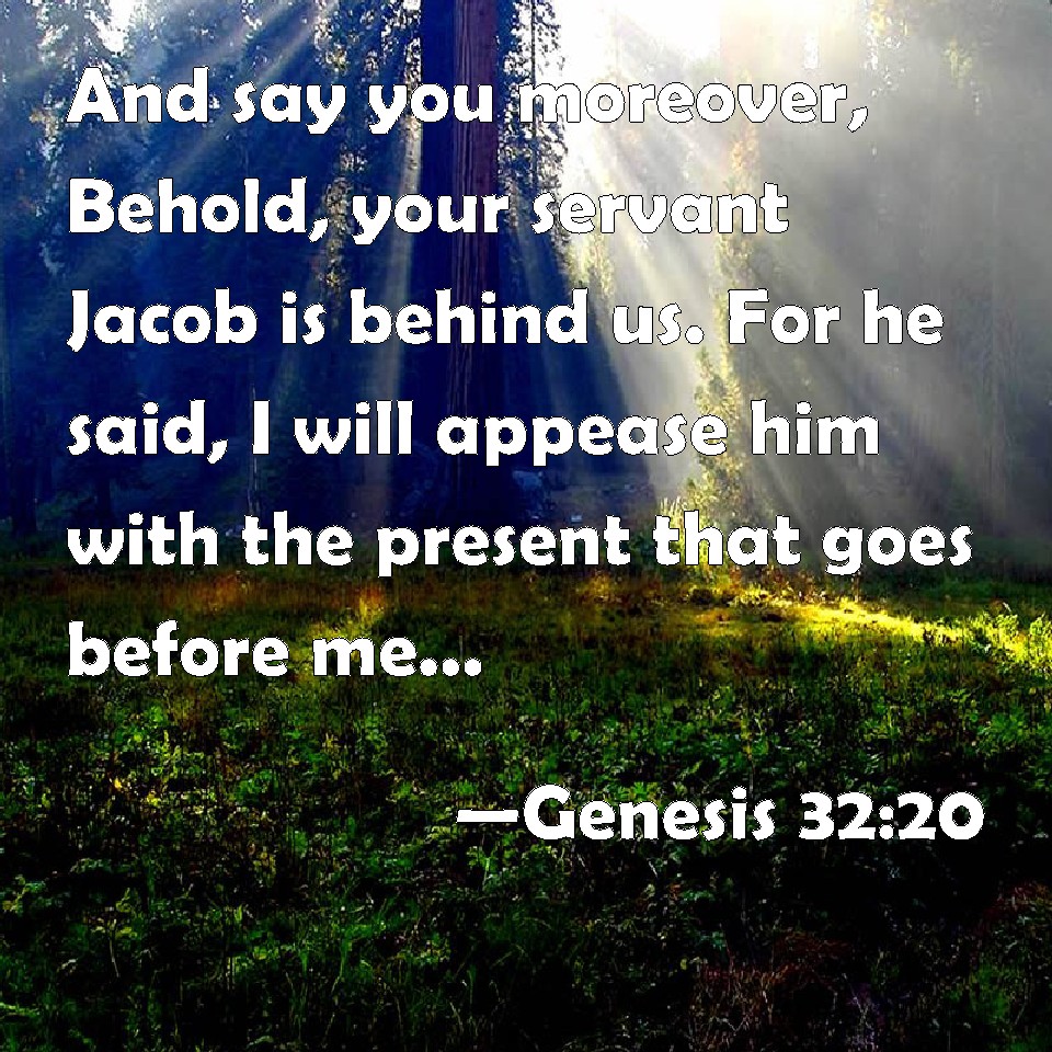 Choose a Background Genesis 32:20 And say you moreover, Behold, your servant Jacob is behind us. For he said, I will appease him with the present that goes before me, and afterward I will see his face; peradventure he will accept of me. KJV: And say ye moreover, Behold, thy servant Jacob is behind us. For he said, I will appease him with the present that goeth before me, and afterward I will see his face; peradventure he will accept of me. DRB: And ye shall add: thy servant Jacob himself also followeth after us: for he said: I will appease him with the presents that go before, and afterwards I will see him, perhaps he will be gracious to me. DBT: And, moreover, ye shall say, Behold, thy servant Jacob is behind us. For he said, I will propitiate him with the gift that goes before me, and afterwards I will see his face: perhaps he will accept me. ERV: and ye shall say, Moreover, behold, thy servant Jacob is behind us. For he said, I will appease him with the present that goeth before me, and afterward I will see his face; peradventure he will accept me. WBT: And say ye moreover, Behold, thy servant Jacob is behind us. For he said, I will appease him with the present that goeth before me, and afterward I will see his face; peradventure he will accept of me. WEB: You shall say, 'Not only that, but behold, your servant, Jacob, is behind us.'" For, he said, "I will appease him with the present that goes before me, and afterward I will see his face. Perhaps he will accept me." YLT: and ye have said also, Lo, thy servant Jacob is behind us;' for he said, 'I pacify his face with the present which is going before me, and afterwards I see his face; it may be he lifteth up my face;'Links Genesis 32:20 NIV • Genesis 32:20 NLT • Genesis 32:20 ESV • Genesis 32:20 NASB • Genesis 32:20 KJV • Genesis 32:20 Interlinear • Genesis 32:20 Commentaries • Genesis 32:20 Parallel Texts • Genesis 32:20 Bible Apps • Genesis 32:20 Parallel • Bible Hub |