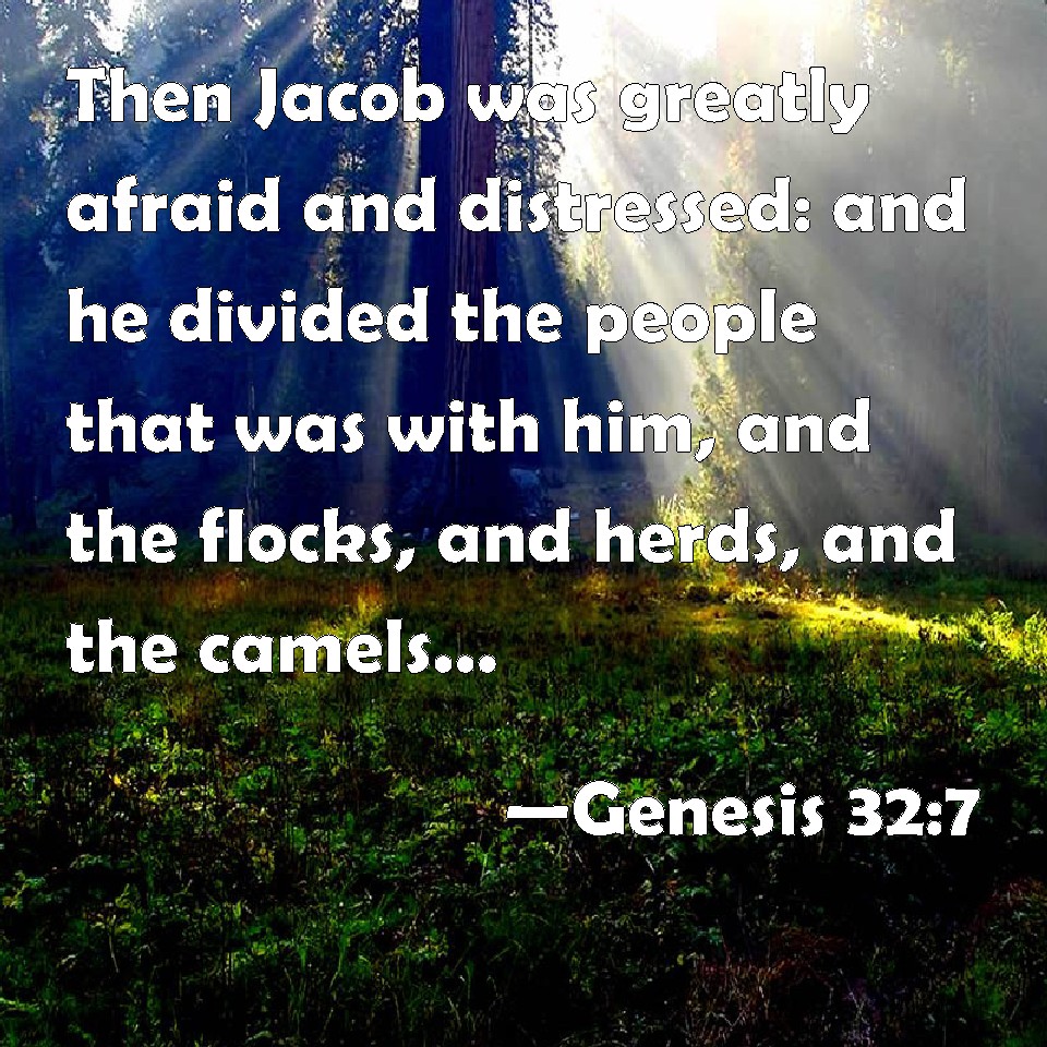 Choose a Background Genesis 32:7 Then Jacob was greatly afraid and distressed: and he divided the people that was with him, and the flocks, and herds, and the camels, into two bands; KJV: Then Jacob was greatly afraid and distressed: and he divided the people that was with him, and the flocks, and herds, and the camels, into two bands; DRB: Then Jacob was greatly afraid; and in his fear divided the people that was with him, and the flocks, and the sheep, and the oxen, and the camels, into two companies, DBT: Then Jacob was greatly afraid, and was distressed; and he divided the people that were with him, and the sheep and the cattle and the camels, into two troops. ERV: Then Jacob was greatly afraid and was distressed: and he divided the people that was with him, and the flocks, and the herds, and the camels, into two companies; WBT: Then Jacob was greatly afraid, and distressed: and he divided the people that were with him, and the flocks, and herds, and camels, into two bands; WEB: Then Jacob was greatly afraid and was distressed. He divided the people who were with him, and the flocks, and the herds, and the camels, into two companies; YLT: and Jacob feareth exceedingly, and is distressed, and he divideth the people who are with him, and the flock, and the herd, and the camels, into two camps,Links Genesis 32:7 NIV • Genesis 32:7 NLT • Genesis 32:7 ESV • Genesis 32:7 NASB • Genesis 32:7 KJV • Genesis 32:7 Interlinear • Genesis 32:7 Commentaries • Genesis 32:7 Parallel Texts • Genesis 32:7 Bible Apps • Genesis 32:7 Parallel • Bible Hub |