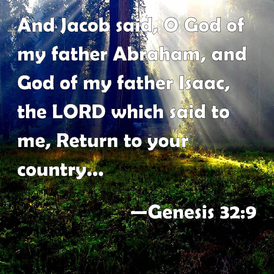 Choose a Background Genesis 32:9 And Jacob said, O God of my father Abraham, and God of my father Isaac, the LORD which said to me, Return to your country, and to your kindred, and I will deal well with you: KJV: And Jacob said, O God of my father Abraham, and God of my father Isaac, the LORD which saidst unto me, Return unto thy country, and to thy kindred, and I will deal well with thee: DRB: And Jacob said: O God of my father Abraham, and God of my father Isaac, O Lord, who saidst to me: Return to thy land and to the place of thy birth, and I will do well for thee, DBT: And Jacob said, God of my father Abraham, and God of my father Isaac, Jehovah, who saidst unto me: Return into thy country and to thy kindred, and I will do thee good, ERV: And Jacob said, O God of my father Abraham, and God of my father Isaac, O LORD, which saidst unto me, Return unto thy country, and to thy kindred, and I will do thee good: WBT: And Jacob said, O God of my father Abraham, and God of my father Isaac, the LORD who saidst to me, Return to thy country, and to thy kindred, and I will deal well with thee; WEB: Jacob said, "God of my father Abraham, and God of my father Isaac, Yahweh, who said to me, 'Return to your country, and to your relatives, and I will do you good,' YLT: And Jacob saith, 'God of my father Abraham, and God of my father Isaac, Jehovah who saith unto me, Turn back to thy land, and to thy kindred, and I do good with thee:Links Genesis 32:9 NIV • Genesis 32:9 NLT • Genesis 32:9 ESV • Genesis 32:9 NASB • Genesis 32:9 KJV • Genesis 32:9 Interlinear • Genesis 32:9 Commentaries • Genesis 32:9 Parallel Texts • Genesis 32:9 Bible Apps • Genesis 32:9 Parallel • Bible Hub |