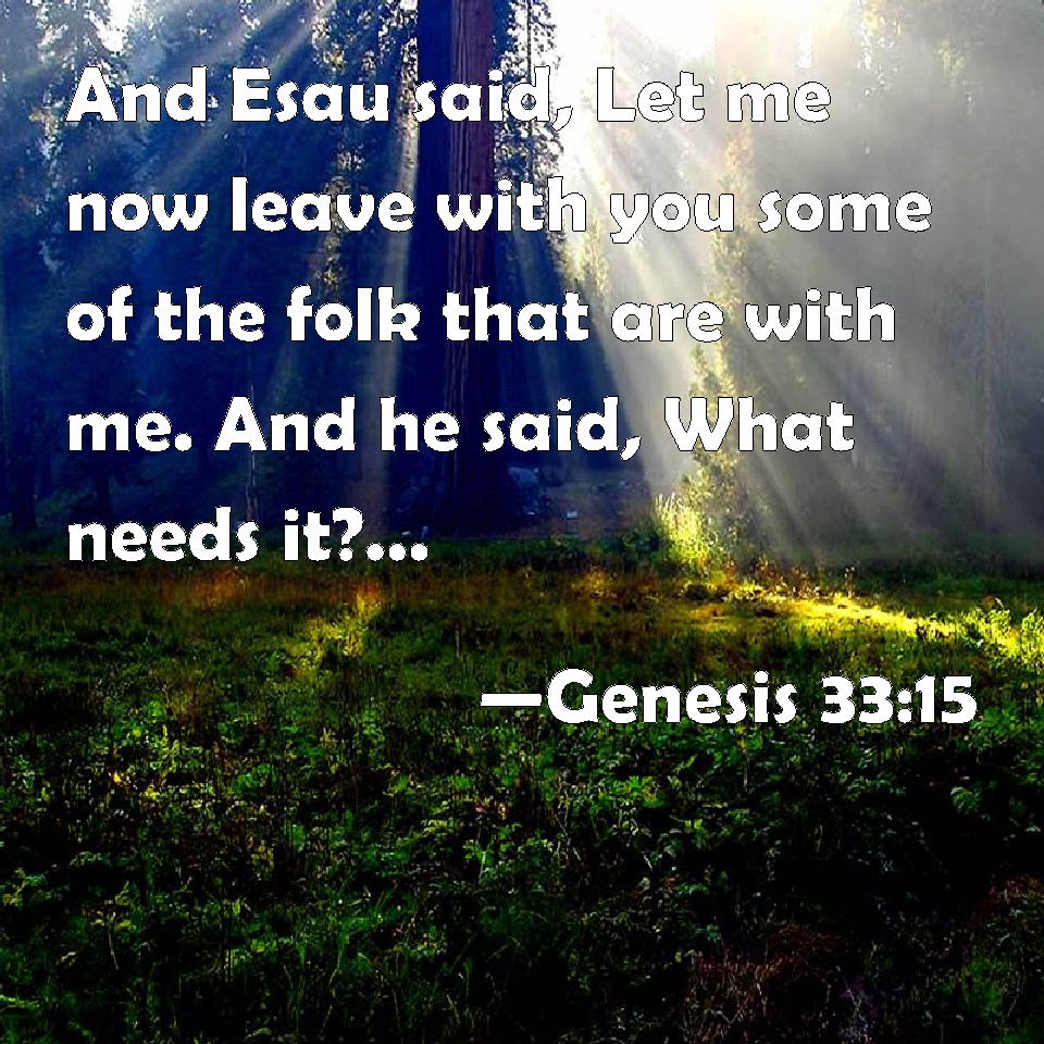Choose a Background Genesis 33:15 And Esau said, Let me now leave with you some of the folk that are with me. And he said, What needs it? let me find grace in the sight of my lord. KJV: And Esau said, Let me now leave with thee some of the folk that are with me. And he said, What needeth it? let me find grace in the sight of my lord. DRB: Esau answered: I beseech thee, that some of the people at least, who are with me, may stay to accompany thee in the way. And he said: There is no necessity: I want nothing else but only to find favor, my lord, in thy sight. DBT: And Esau said, Let me now leave with thee some of the people that are with me. And he said, What need? Let me find favour in the eyes of my lord. ERV: And Esau said, Let me now leave with thee some of the folk that are with me. And he said, What needeth it? let me find grace in the sight of my lord. WBT: And Esau said, Let me now leave with thee some of the people that are with me: And he said, What needeth it? Let me find grace in the sight of my lord. WEB: Esau said, "Let me now leave with you some of the folk who are with me." He said, "Why? Let me find favor in the sight of my lord." YLT: And Esau saith, 'Let me, I pray thee, place with thee some of the people who are with me;' and he said, 'Why is this? I find grace in the eyes of my lord.'Links Genesis 33:15 NIV • Genesis 33:15 NLT • Genesis 33:15 ESV • Genesis 33:15 NASB • Genesis 33:15 KJV • Genesis 33:15 Interlinear • Genesis 33:15 Commentaries • Genesis 33:15 Parallel Texts • Genesis 33:15 Bible Apps • Genesis 33:15 Parallel • Bible Hub |