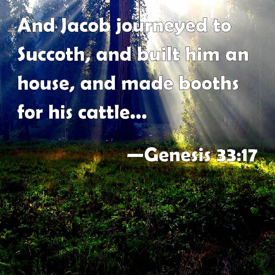 Choose a Background Genesis 33:17 And Jacob journeyed to Succoth, and built him an house, and made booths for his cattle: therefore the name of the place is called Succoth. KJV: And Jacob journeyed to Succoth, and built him an house, and made booths for his cattle: therefore the name of the place is called Succoth. DRB: And Jacob came to Socoth: where having built a house, and pitched tents, he called the name of the place Socoth, that is, Tents. DBT: And Jacob journeyed to Succoth, and built himself a house, and for his cattle he made booths. Therefore the name of the place was called Succoth. ERV: And Jacob journeyed to Succoth, and built him an house, and made booths for his cattle: therefore the name of the place is called Succoth. WBT: And Jacob journeyed to Succoth, and built him a house, and made booths for his cattle: therefore the name of the place is called Succoth. WEB: Jacob traveled to Succoth, built himself a house, and made shelters for his livestock. Therefore the name of the place is called Succoth. YLT: and Jacob hath journeyed to Succoth, and buildeth to himself a house, and for his cattle hath made booths, therefore hath he called the name of the place Succoth.Links Genesis 33:17 NIV • Genesis 33:17 NLT • Genesis 33:17 ESV • Genesis 33:17 NASB • Genesis 33:17 KJV • Genesis 33:17 Interlinear • Genesis 33:17 Commentaries • Genesis 33:17 Parallel Texts • Genesis 33:17 Bible Apps • Genesis 33:17 Parallel • Bible Hub |
