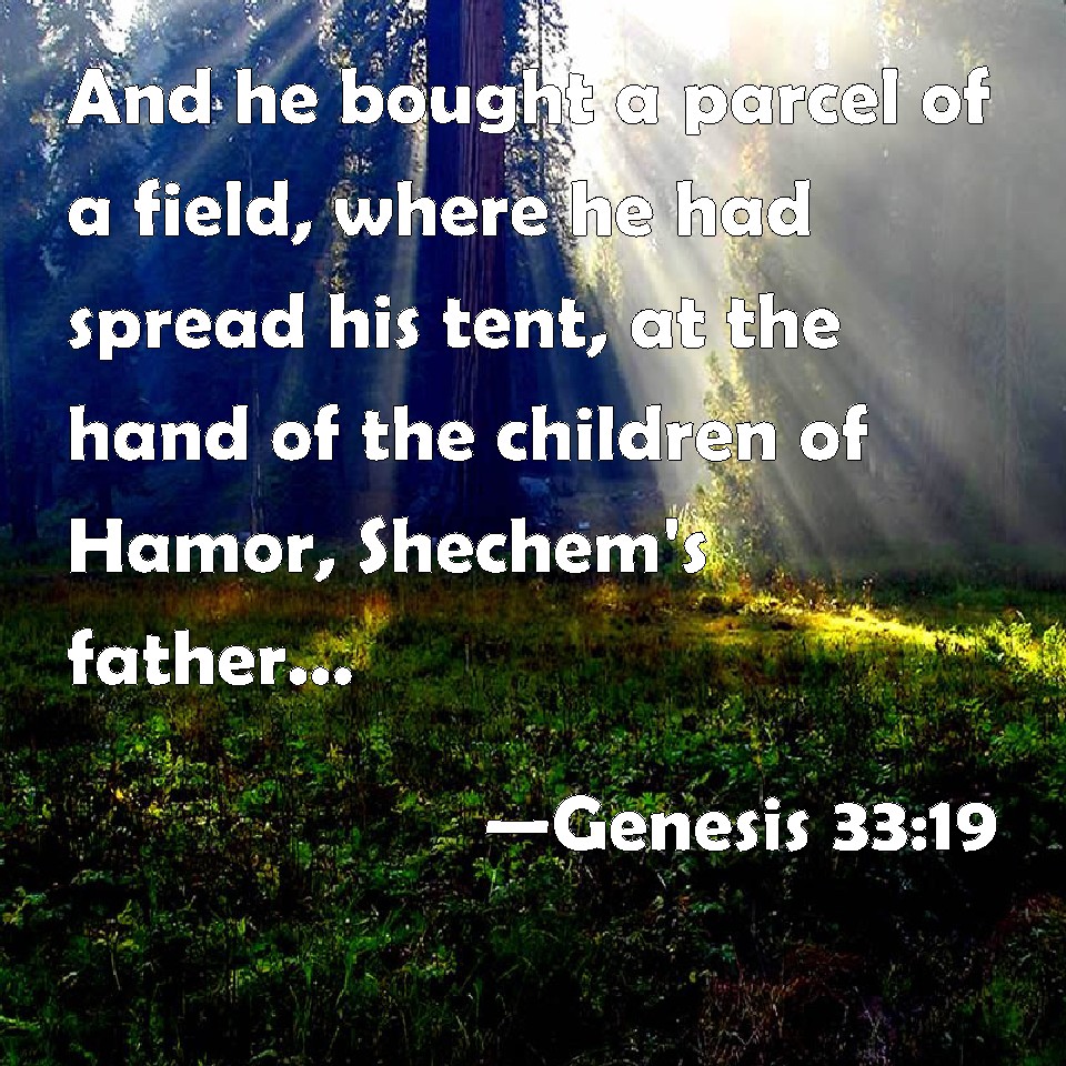 Choose a Background Genesis 33:19 And he bought a parcel of a field, where he had spread his tent, at the hand of the children of Hamor, Shechem's father, for an hundred pieces of money. KJV: And he bought a parcel of a field, where he had spread his tent, at the hand of the children of Hamor, Shechem's father, for an hundred pieces of money. DRB: And he bought that part of the field, in which he pitched his tents, of the children of Hemor, the father of Sichem for a hundred lambs. DBT: And he bought the portion of the field where he had spread his tent, of the hand of the sons of Hamor, Shechem's father, for a hundred kesitahs. ERV: And he bought the parcel of ground, where he had spread his tent, at the hand of the children of Hamor, Shechem's father, for an hundred pieces of money. WBT: And he bought a part of a field, where he had spread his tent, at the hand of the children of Hamor, Shechem's father, for a hundred pieces of money. WEB: He bought the parcel of ground where he had spread his tent, at the hand of the children of Hamor, Shechem's father, for one hundred pieces of money. YLT: and he buyeth the portion of the field where he hath stretched out his tent, from the hand of the sons of Hamor, father of Shechem, for a hundred kesitah;Links Genesis 33:19 NIV • Genesis 33:19 NLT • Genesis 33:19 ESV • Genesis 33:19 NASB • Genesis 33:19 KJV • Genesis 33:19 Interlinear • Genesis 33:19 Commentaries • Genesis 33:19 Parallel Texts • Genesis 33:19 Bible Apps • Genesis 33:19 Parallel • Bible Hub |
