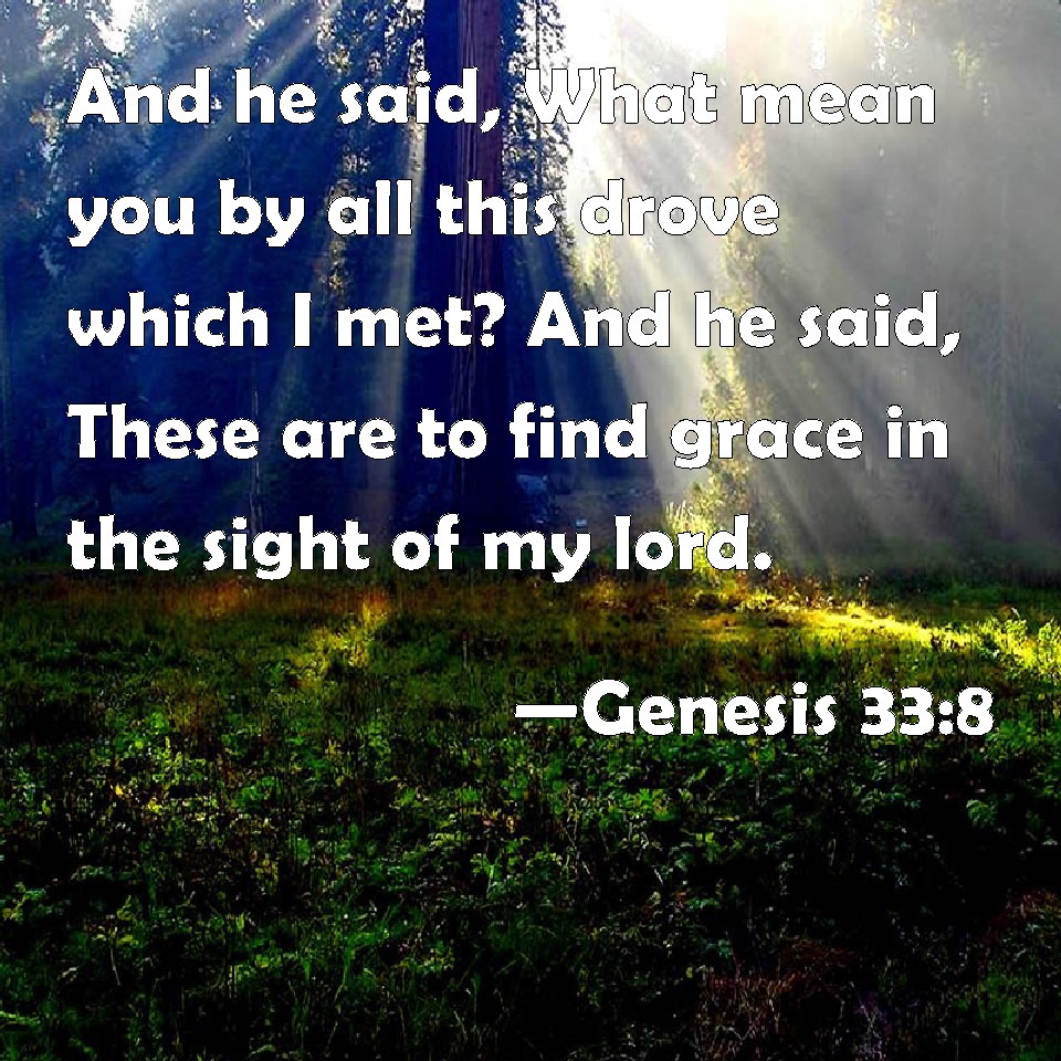 Choose a Background Genesis 33:8 And he said, What mean you by all this drove which I met? And he said, These are to find grace in the sight of my lord. KJV: And he said, What meanest thou by all this drove which I met? And he said, These are to find grace in the sight of my lord. DRB: And Esau said: What are the droves that I met? He answered: That I might find favor before my lord. DBT: And he said, What meanest thou by all the drove which I met? And he said, To find favour in the eyes of my lord. ERV: And he said, What meanest thou by all this company which I met? And he said, To find grace in the sight of my lord. WBT: And he said, What meanest thou by all this drove which I met? And he said, these are to find grace in the sight of my lord. WEB: Esau said, "What do you mean by all this company which I met?" Jacob said, "To find favor in the sight of my lord." YLT: And he saith, 'What to thee is all this camp which I have met?' and he saith, 'To find grace in the eyes of my lord.'Links Genesis 33:8 NIV • Genesis 33:8 NLT • Genesis 33:8 ESV • Genesis 33:8 NASB • Genesis 33:8 KJV • Genesis 33:8 Interlinear • Genesis 33:8 Commentaries • Genesis 33:8 Parallel Texts • Genesis 33:8 Bible Apps • Genesis 33:8 Parallel • Bible Hub |