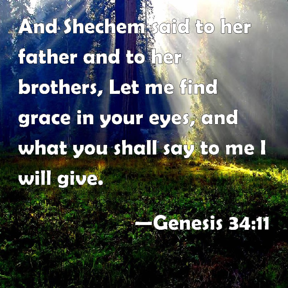 Choose a Background Genesis 34:11 And Shechem said to her father and to her brothers, Let me find grace in your eyes, and what you shall say to me I will give. KJV: And Shechem said unto her father and unto her brethren, Let me find grace in your eyes, and what ye shall say unto me I will give. DRB: Sichem also said to her father and to her brethren: Let me find favor in your sight: and whatsoever you shall appoint I will give. DBT: And Shechem said to her father and to her brethren, Let me find favour in your eyes; and what ye shall say to me I will give. ERV: And Shechem said unto her father and unto her brethren, Let me find grace in your eyes, and what ye shall say unto me I will give. WBT: And Shechem said to her father, and to her brethren, Let me find favor in your eyes, and what ye shall say to me, I will give. WEB: Shechem said to her father and to her brothers, "Let me find favor in your eyes, and whatever you will tell me I will give. YLT: And Shechem saith unto her father, and unto her brethren, 'Let me find grace in your eyes, and that which ye say unto me, I give;Links Genesis 34:11 NIV • Genesis 34:11 NLT • Genesis 34:11 ESV • Genesis 34:11 NASB • Genesis 34:11 KJV • Genesis 34:11 Interlinear • Genesis 34:11 Commentaries • Genesis 34:11 Parallel Texts • Genesis 34:11 Bible Apps • Genesis 34:11 Parallel • Bible Hub |