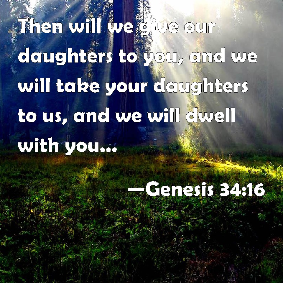 Choose a Background Genesis 34:16 Then will we give our daughters to you, and we will take your daughters to us, and we will dwell with you, and we will become one people. KJV: Then will we give our daughters unto you, and we will take your daughters to us, and we will dwell with you, and we will become one people. DRB: Then will we mutually give and take your daughters, and ours: and we will dwell with you, and will be one people: DBT: then will we give our daughters to you, and take your daughters to us, and we will dwell with you, and be one people. ERV: then will we give our daughters unto you, and we will take your daughters to us, and we will dwell with you, and we will become one people. WBT: Then will we give our daughters to you, and we will take your daughters to us, and we will dwell with you, and we will become one people. WEB: then will we give our daughters to you, and we will take your daughters to us, and we will dwell with you, and we will become one people. YLT: then we have given our daughters to you, and your daughters we take to ourselves, and we have dwelt with you, and have become one people;Links Genesis 34:16 NIV • Genesis 34:16 NLT • Genesis 34:16 ESV • Genesis 34:16 NASB • Genesis 34:16 KJV • Genesis 34:16 Interlinear • Genesis 34:16 Commentaries • Genesis 34:16 Parallel Texts • Genesis 34:16 Bible Apps • Genesis 34:16 Parallel • Bible Hub |
