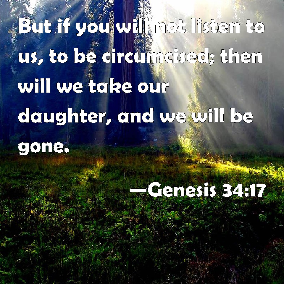Choose a Background Genesis 34:17 But if you will not listen to us, to be circumcised; then will we take our daughter, and we will be gone. KJV: But if ye will not hearken unto us, to be circumcised; then will we take our daughter, and we will be gone. DRB: But if you will not be circumcised, we will take our daughter and depart: DBT: But if ye do not hearken to us, to be circumcised, then will we take our daughter and go away. ERV: But if ye will not hearken unto us, to be circumcised; then will we take our daughter, and we will be gone. WBT: But if ye will not hearken to us, to be circumcised; then will we take our daughter, and we will be gone. WEB: But if you will not listen to us, to be circumcised, then we will take our sister, and we will be gone." YLT: and if ye hearken not unto us to be circumcised, then we have taken our daughter, and have gone.'Links Genesis 34:17 NIV • Genesis 34:17 NLT • Genesis 34:17 ESV • Genesis 34:17 NASB • Genesis 34:17 KJV • Genesis 34:17 Interlinear • Genesis 34:17 Commentaries • Genesis 34:17 Parallel Texts • Genesis 34:17 Bible Apps • Genesis 34:17 Parallel • Bible Hub |