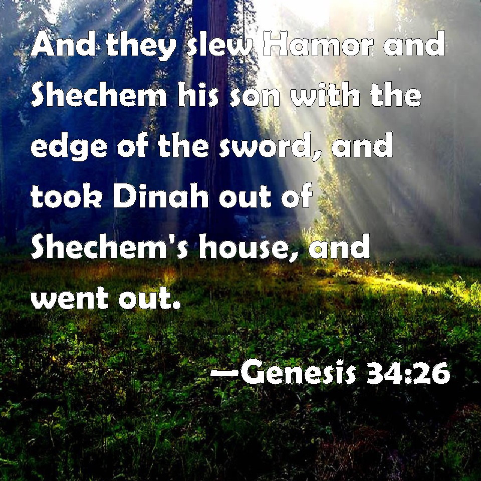 Choose a Background Genesis 34:26 And they slew Hamor and Shechem his son with the edge of the sword, and took Dinah out of Shechem's house, and went out. KJV: And they slew Hamor and Shechem his son with the edge of the sword, and took Dinah out of Shechem's house, and went out. DRB: And they killed also Hemor and Sichem, and took away their sister Dina, out of Sichem's house. DBT: And Hamor and Shechem his son they slew with the edge of the sword; and took Dinah out of Shechem's house; and went out. ERV: And they slew Hamor and Shechem his son with the edge of the sword, and took Dinah out of Shechem's house, and went forth. WBT: And they slew Hamor and Shechem his son with the edge of the sword, and took Dinah out of Shechem's house, and went out. WEB: They killed Hamor and Shechem, his son, with the edge of the sword, and took Dinah out of Shechem's house, and went away. YLT: and Hamor, and Shechem his son, they have slain by the mouth of the sword, and they take Dinah out of Shechem's house, and go out.Links Genesis 34:26 NIV • Genesis 34:26 NLT • Genesis 34:26 ESV • Genesis 34:26 NASB • Genesis 34:26 KJV • Genesis 34:26 Interlinear • Genesis 34:26 Commentaries • Genesis 34:26 Parallel Texts • Genesis 34:26 Bible Apps • Genesis 34:26 Parallel • Bible Hub |