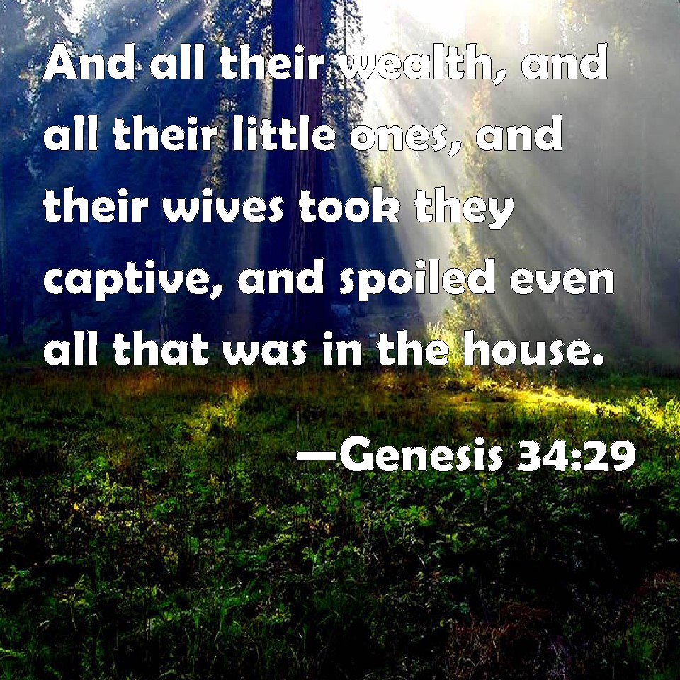 Choose a Background Genesis 34:29 And all their wealth, and all their little ones, and their wives took they captive, and spoiled even all that was in the house. KJV: And all their wealth, and all their little ones, and their wives took they captive, and spoiled even all that was in the house. DRB: and their children and wives they took captive, DBT: and all their goods, and all their little ones, and their wives took they captive, and plundered them, and all that was in the houses. ERV: and all their wealth, and all their little ones and their wives, took they captive and spoiled, even all that was in the house. WBT: And all their wealth, and all their little ones, and their wives they took captive, and spoiled even all that was in the house. WEB: and all their wealth. They took captive all their little ones and their wives, and took as plunder everything that was in the house. YLT: and all their wealth, and all their infants, and their wives they have taken captive, and they spoil also all that is in the house.Links Genesis 34:29 NIV • Genesis 34:29 NLT • Genesis 34:29 ESV • Genesis 34:29 NASB • Genesis 34:29 KJV • Genesis 34:29 Interlinear • Genesis 34:29 Commentaries • Genesis 34:29 Parallel Texts • Genesis 34:29 Bible Apps • Genesis 34:29 Parallel • Bible Hub |