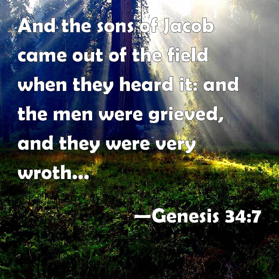 Choose a Background Genesis 34:7 And the sons of Jacob came out of the field when they heard it: and the men were grieved, and they were very wroth, because he had worked folly in Israel in lying with Jacob's daughter: which thing ought not to be done. KJV: And the sons of Jacob came out of the field when they heard it: and the men were grieved, and they were very wroth, because he had wrought folly in Israel in lying with Jacob's daughter; which thing ought not to be done. DRB: Behold his sons came from the field: and hearing what had passed, they were exceeding angry, because he had done a foul thing in Israel, and committed an unlawful act, in ravishing Jacob's daughter, DBT: And the sons of Jacob came from the fields when they heard it; and the men were grieved, and they were very angry, because he had wrought what was disgraceful in Israel, in lying with Jacob's daughter, which thing ought not to be done. ERV: And the sons of Jacob came in from the field when they heard it: and the men were grieved, and they were very wroth, because he had wrought folly in Israel in lying with Jacob's daughter; which thing ought not to be done. WBT: And the sons of Jacob came from the field when they heard it: and the men were grieved, and they were very wroth, because he had wrought folly in Israel, in lying with Jacob's daughter; which thing ought not to be done. WEB: The sons of Jacob came in from the field when they heard it. The men were grieved, and they were very angry, because he had done folly in Israel in lying with Jacob's daughter; a which thing ought not to be done. YLT: and the sons of Jacob came in from the field when they heard, and the men grieve themselves, and it is very displeasing to them, for folly he hath done against Israel, to lie with the daughter of Jacob — and so it is not done.Links Genesis 34:7 NIV • Genesis 34:7 NLT • Genesis 34:7 ESV • Genesis 34:7 NASB • Genesis 34:7 KJV • Genesis 34:7 Interlinear • Genesis 34:7 Commentaries • Genesis 34:7 Parallel Texts • Genesis 34:7 Bible Apps • Genesis 34:7 Parallel • Bible Hub |