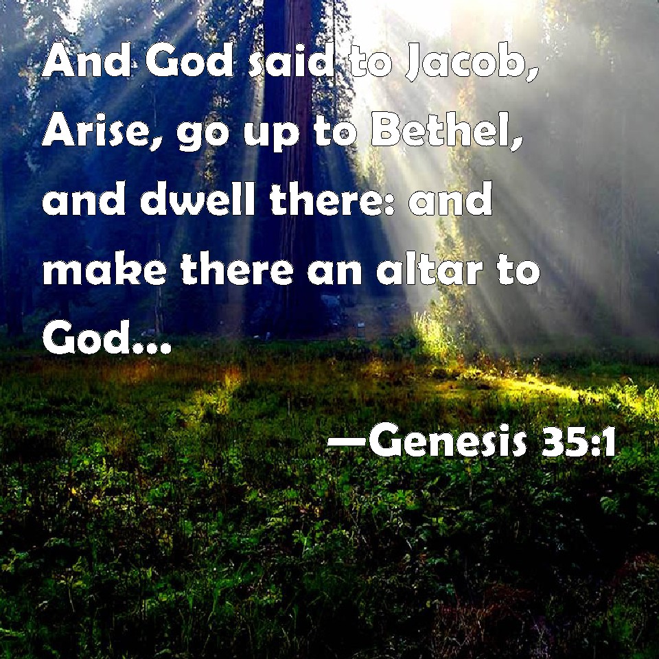Choose a Background Genesis 35:1 And God said to Jacob, Arise, go up to Bethel, and dwell there: and make there an altar to God, that appeared to you when you fled from the face of Esau your brother. KJV: And God said unto Jacob, Arise, go up to Bethel, and dwell there: and make there an altar unto God, that appeared unto thee when thou fleddest from the face of Esau thy brother. DRB: In the meantime God said to Jacob: Arise, and go up to Bethel, and dwell there, and make there an altar to God, who appeared to thee when thou didst flee from Esau thy brother. DBT: And God said to Jacob, Arise, go up to Bethel, and dwell there, and make there an altar unto the God that appeared unto thee when thou fleddest from the face of Esau thy brother. ERV: And God said unto Jacob, Arise, go up to Beth-el, and dwell there: and make there an altar unto God, who appeared unto thee when thou fleddest from the face of Esau thy brother. WBT: And God said to Jacob, Arise, go up to Beth-el, and dwell there: and make there an altar to God, who appeared to thee when thou fleddest from the face of Esau thy brother. WEB: God said to Jacob, "Arise, go up to Bethel, and live there. Make there an altar to God, who appeared to you when you fled from the face of Esau your brother." YLT: And God saith unto Jacob, 'Rise, go up to Bethel, and dwell there, and make there an altar to God, who appeared unto thee in thy fleeing from the face of Esau thy brother.'Links Genesis 35:1 NIV • Genesis 35:1 NLT • Genesis 35:1 ESV • Genesis 35:1 NASB • Genesis 35:1 KJV • Genesis 35:1 Interlinear • Genesis 35:1 Commentaries • Genesis 35:1 Parallel Texts • Genesis 35:1 Bible Apps • Genesis 35:1 Parallel • Bible Hub |