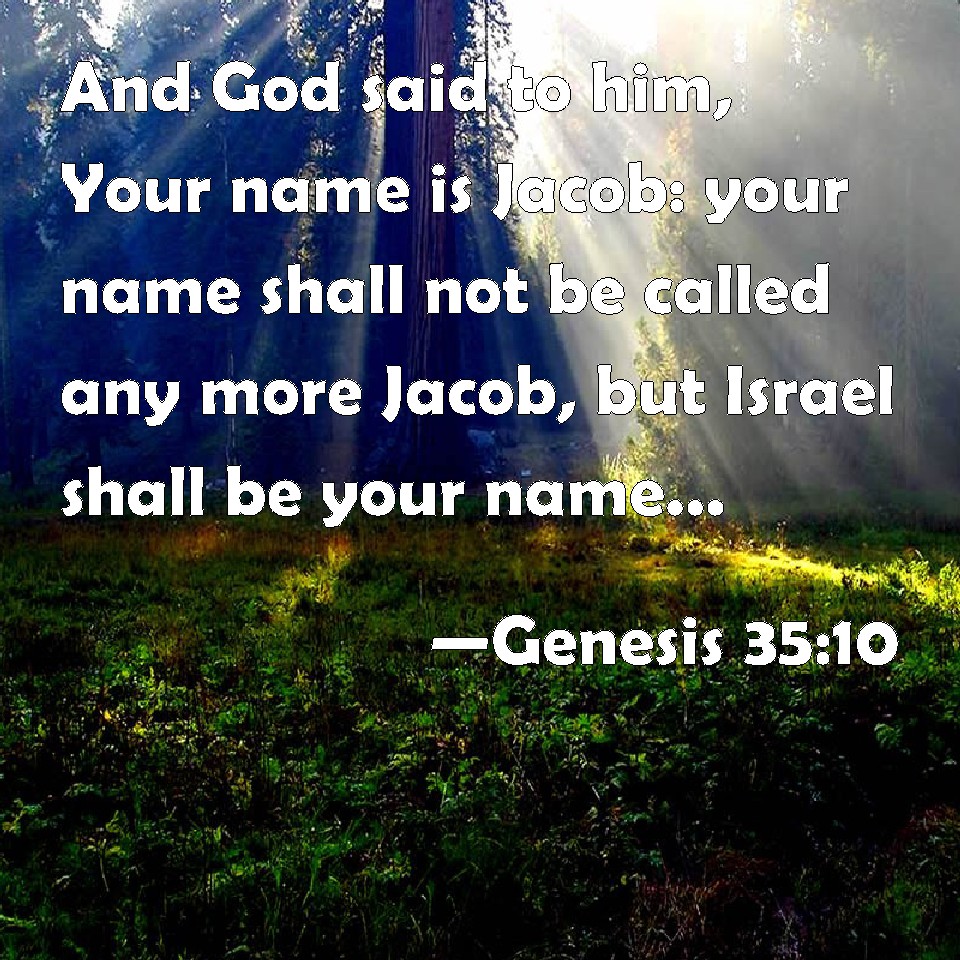 Choose a Background Genesis 35:10 And God said to him, Your name is Jacob: your name shall not be called any more Jacob, but Israel shall be your name: and he called his name Israel. KJV: And God said unto him, Thy name is Jacob: thy name shall not be called any more Jacob, but Israel shall be thy name: and he called his name Israel. DRB: Saying: Thou shalt not be called any more Jacob, but Israel shall be thy name. And he called him Israel. DBT: And God said to him, Thy name is Jacob: thy name shall not henceforth be called Jacob, but Israel shall be thy name. And he called his name Israel. ERV: And God said unto him, Thy name is Jacob: thy name shall not be called any more Jacob, but Israel shall be thy name: and he called his name Israel. WBT: And God said to him, Thy name is Jacob: thy name shall not be called any more Jacob, but Israel shall be thy name; and he called his name Israel. WEB: God said to him, "Your name is Jacob. Your name shall not be Jacob any more, but your name will be Israel." He named him Israel. YLT: and God saith to him, 'Thy name is Jacob: thy name is no more called Jacob, but Israel is thy name;' and He calleth his name Israel.Links Genesis 35:10 NIV • Genesis 35:10 NLT • Genesis 35:10 ESV • Genesis 35:10 NASB • Genesis 35:10 KJV • Genesis 35:10 Interlinear • Genesis 35:10 Commentaries • Genesis 35:10 Parallel Texts • Genesis 35:10 Bible Apps • Genesis 35:10 Parallel • Bible Hub |