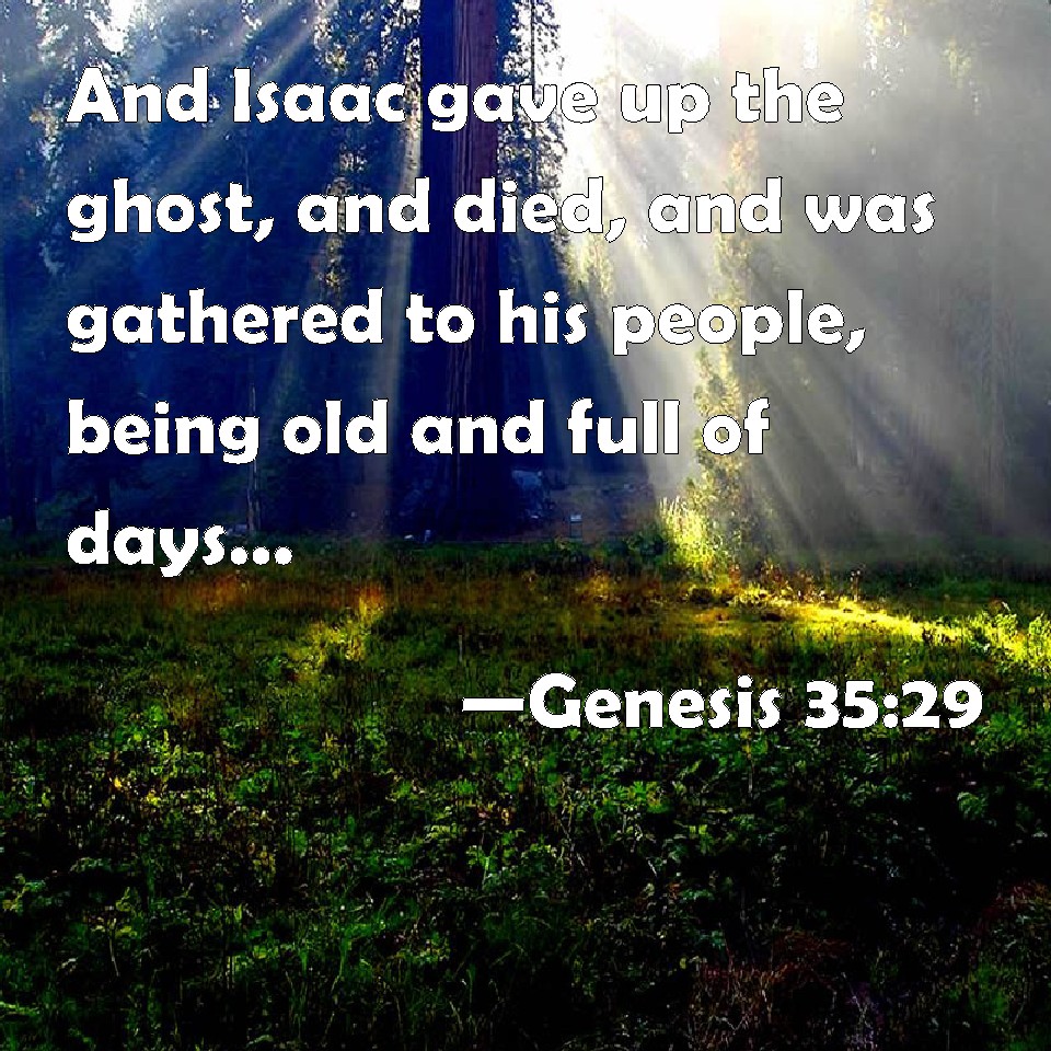 Choose a Background Genesis 35:29 And Isaac gave up the ghost, and died, and was gathered to his people, being old and full of days: and his sons Esau and Jacob buried him. KJV: And Isaac gave up the ghost, and died, and was gathered unto his people, being old and full of days: and his sons Esau and Jacob buried him. DRB: And being spent with age he died, and was gathered to his people, being old and full of days: and his sons Esau and Jacob buried him. DBT: And Isaac expired and died, and was gathered to his peoples, old and full of days. And his sons Esau and Jacob buried him. ERV: And Isaac gave up the ghost, and died, and was gathered unto his people, old and full of days: and Esau and Jacob his sons buried him. WBT: And Isaac expired and died, and was gathered to his people, being old and full of days; and his sons Esau and Jacob buried him. WEB: Isaac gave up the spirit, and died, and was gathered to his people, old and full of days. Esau and Jacob, his sons, buried him. YLT: and Isaac expireth, and dieth, and is gathered unto his people, aged and satisfied with days; and bury him do Esau and Jacob his sons.Links Genesis 35:29 NIV • Genesis 35:29 NLT • Genesis 35:29 ESV • Genesis 35:29 NASB • Genesis 35:29 KJV • Genesis 35:29 Interlinear • Genesis 35:29 Commentaries • Genesis 35:29 Parallel Texts • Genesis 35:29 Bible Apps • Genesis 35:29 Parallel • Bible Hub |