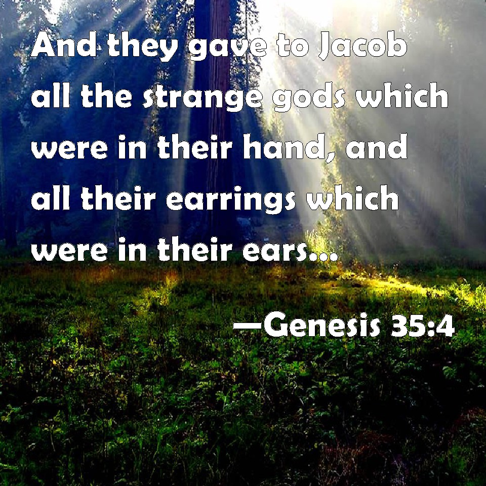Choose a Background Genesis 35:4 And they gave to Jacob all the strange gods which were in their hand, and all their earrings which were in their ears; and Jacob hid them under the oak which was by Shechem. KJV: And they gave unto Jacob all the strange gods which were in their hand, and all their earrings which were in their ears; and Jacob hid them under the oak which was by Shechem. DRB: So they gave him all the strange gods they had, and the earrings which were in their ears: and he buried them under the turpentine tree, that is behind the city of Sichem. DBT: And they gave to Jacob all the strange gods that were in their hand, and the rings that were in their ears, and Jacob hid them under the terebinth that is by Shechem. ERV: And they gave unto Jacob all the strange gods which were in their hand, and the rings which were in their ears; and Jacob hid them under the oak which was by Shechem. WBT: And they gave to Jacob all the strange gods which were in their hand, and the ear-rings which were in their ears; and Jacob hid them under the oak which was by Shechem. WEB: They gave to Jacob all the foreign gods which were in their hands, and the rings which were in their ears; and Jacob hid them under the oak which was by Shechem. YLT: And they give unto Jacob all the gods of the stranger that are in their hand, and the rings that are in their ears, and Jacob hideth them under the oak which is by Shechem;Links Genesis 35:4 NIV • Genesis 35:4 NLT • Genesis 35:4 ESV • Genesis 35:4 NASB • Genesis 35:4 KJV • Genesis 35:4 Interlinear • Genesis 35:4 Commentaries • Genesis 35:4 Parallel Texts • Genesis 35:4 Bible Apps • Genesis 35:4 Parallel • Bible Hub |