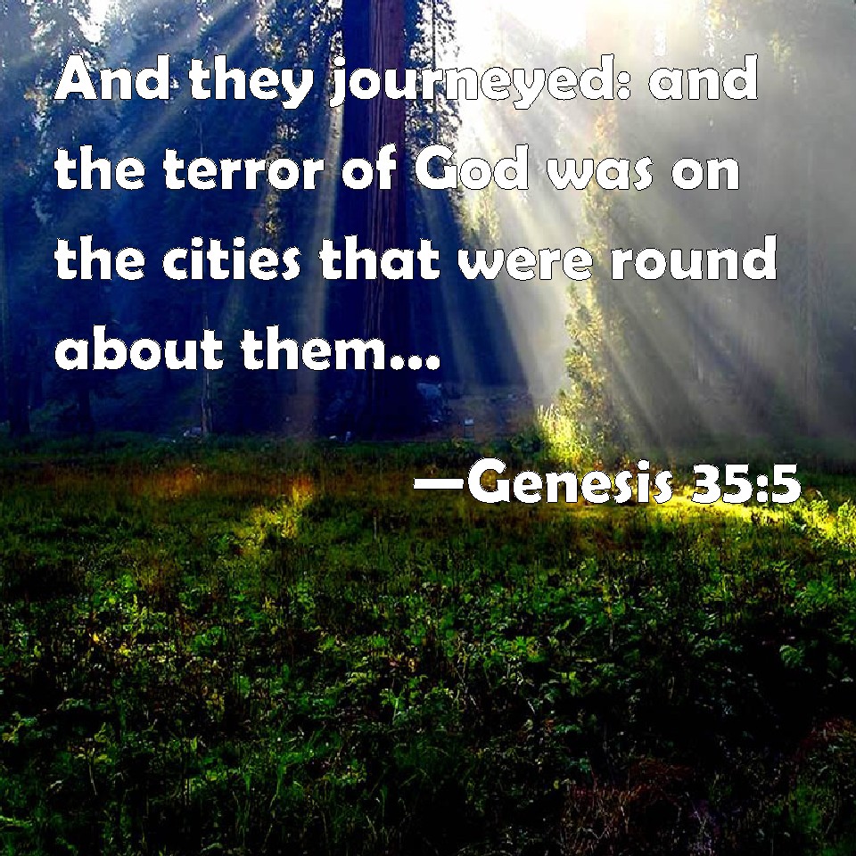 Choose a Background Genesis 35:5 And they journeyed: and the terror of God was on the cities that were round about them, and they did not pursue after the sons of Jacob. KJV: And they journeyed: and the terror of God was upon the cities that were round about them, and they did not pursue after the sons of Jacob. DRB: And when they were departed, the terror of God fell upon all the cities round about, and they durst not pursue after them as they went away. DBT: And they journeyed; and the terror of God was upon the cities that were round about them, and they did not pursue after the sons of Jacob. ERV: And they journeyed: and a great terror was upon the cities that were round about them, and they did not pursue after the sons of Jacob. WBT: And they journeyed: and the terror of God was on the cities that were round them, and they did not pursue after the sons of Jacob. WEB: They traveled, and a terror of God was on the cities that were around them, and they didn't pursue the sons of Jacob. YLT: and they journey, and the terror of God is on the cities which are round about them, and they have not pursued after the sons of Jacob.Links Genesis 35:5 NIV • Genesis 35:5 NLT • Genesis 35:5 ESV • Genesis 35:5 NASB • Genesis 35:5 KJV • Genesis 35:5 Interlinear • Genesis 35:5 Commentaries • Genesis 35:5 Parallel Texts • Genesis 35:5 Bible Apps • Genesis 35:5 Parallel • Bible Hub |
