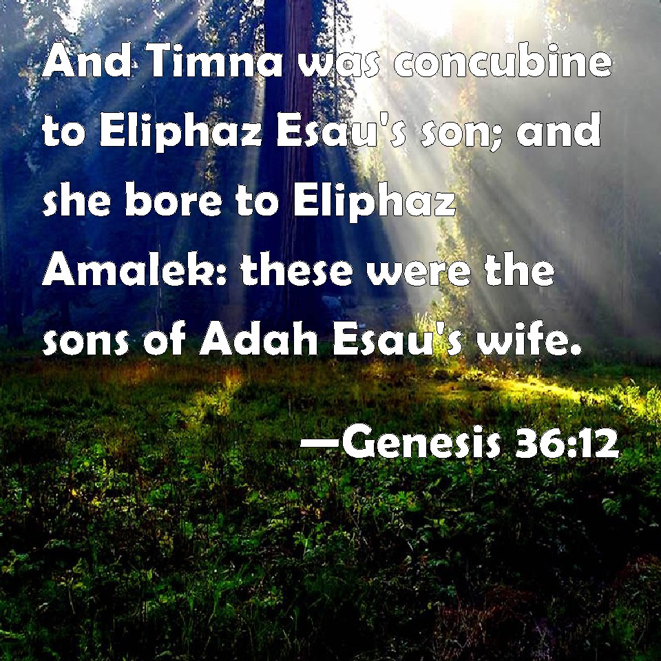 Genesis 36:12 And Timna was concubine to Eliphaz Esau's son; and she bore to Eliphaz Amalek: these were the sons of Adah Esau's wife.