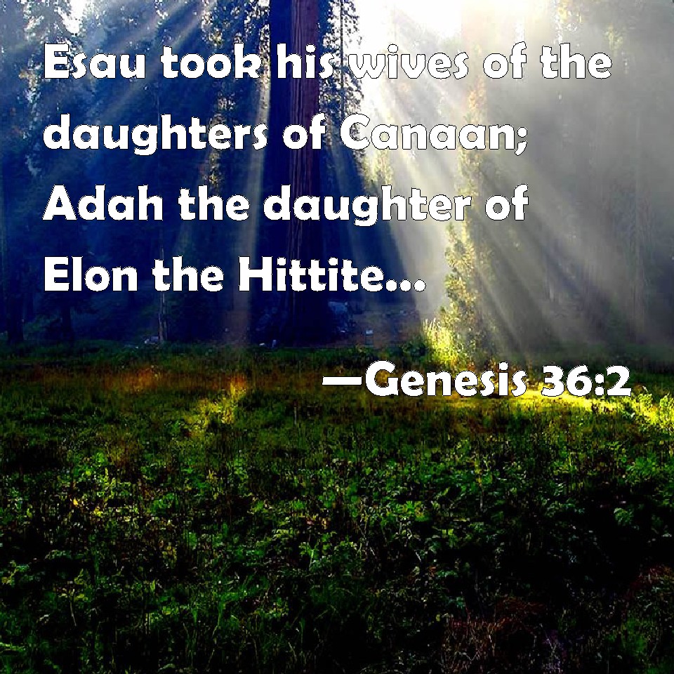 Choose a Background Genesis 36:2 Esau took his wives of the daughters of Canaan; Adah the daughter of Elon the Hittite, and Aholibamah the daughter of Anah the daughter of Zibeon the Hivite; KJV: Esau took his wives of the daughters of Canaan; Adah the daughter of Elon the Hittite, and Aholibamah the daughter of Anah the daughter of Zibeon the Hivite; DRB: Esau took wives of the daughters of Chanaan: Ada the daughter of Elon the Hethite, and Oolibama the daughter of Ana, the daughter of Sebeon the Hevite: DBT: Esau took his wives of the daughters of Canaan: Adah the daughter of Elon the Hittite, and Oholibamah the daughter of Anah, daughter of Zibeon the Hivite, ERV: Esau took his wives of the daughters of Canaan; Adah the daughter of Elon the Hittite, and Oholibamah the daughter of Anah, the daughter of Zibeon the Hivite; WBT: Esau took his wives of the daughters of Canaan; Adah the daughter of Elon the Hittite, and Aholibamah the daughter of Anah the daughter of Zibeon the Hivite; WEB: Esau took his wives from the daughters of Canaan: Adah the daughter of Elon, the Hittite; and Oholibamah the daughter of Anah, the daughter of Zibeon, the Hivite; YLT: Esau hath taken his wives from the daughters of Canaan: Adah daughter of Elon the Hittite, and Aholibamah daughter of Anah, daughter of Zibeon the Hivite,Links Genesis 36:2 NIV • Genesis 36:2 NLT • Genesis 36:2 ESV • Genesis 36:2 NASB • Genesis 36:2 KJV • Genesis 36:2 Interlinear • Genesis 36:2 Commentaries • Genesis 36:2 Parallel Texts • Genesis 36:2 Bible Apps • Genesis 36:2 Parallel • Bible Hub |