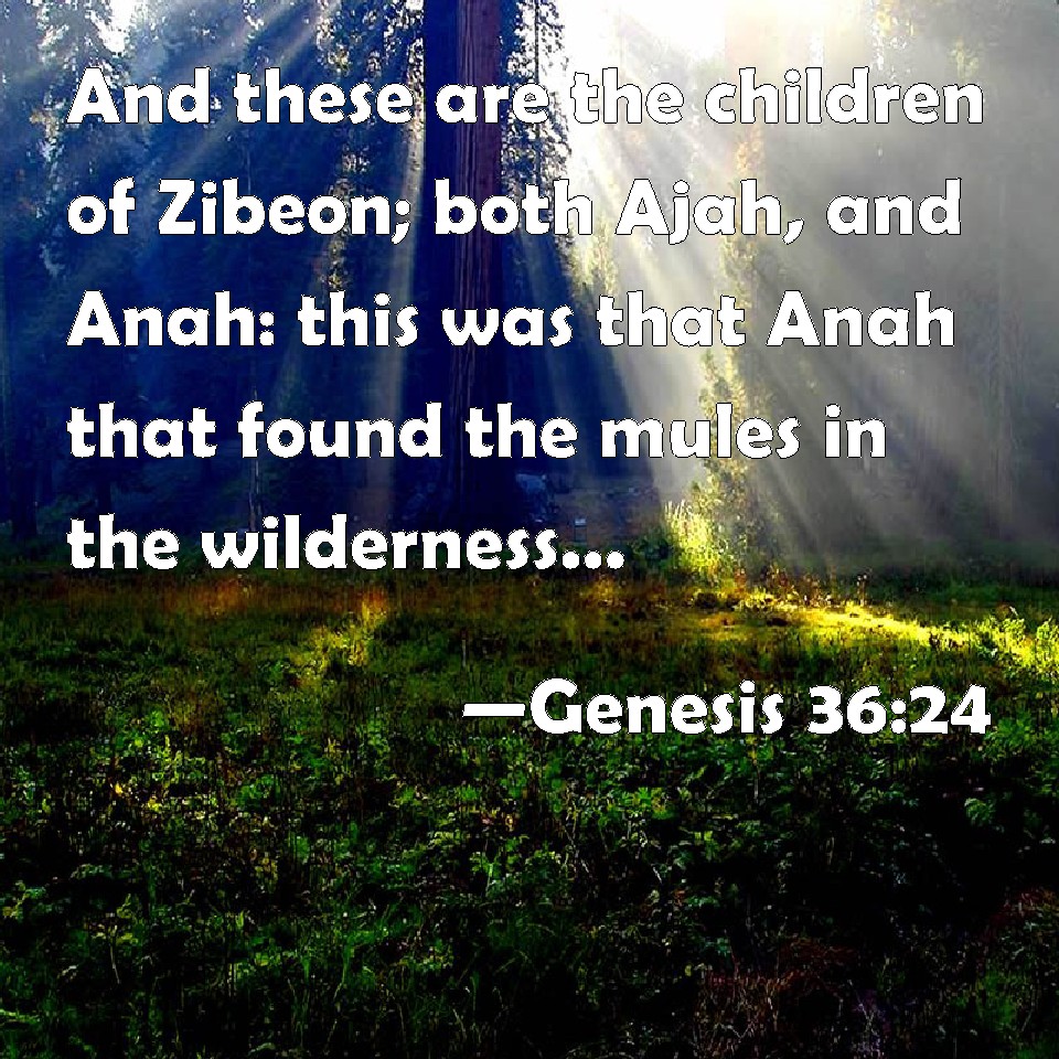 Choose a Background Genesis 36:24 And these are the children of Zibeon; both Ajah, and Anah: this was that Anah that found the mules in the wilderness, as he fed the asses of Zibeon his father. KJV: And these are the children of Zibeon; both Ajah, and Anah: this was that Anah that found the mules in the wilderness, as he fed the asses of Zibeon his father. DRB: And these the sons of Sebeon: Aia and Ana. This is Ana that found the hot waters in the wilderness, when he fed the asses of Sebeon his father: DBT: And these are the sons of Zibeon: both Ajah And Anah. This is the Anah that found the warm springs in the wilderness as he fed the asses of Zibeon his father. ERV: And these are the children of Zibeon; Aiah and Anah: this is Anah who found the hot springs in the wilderness, as he fed the asses of Zibeon his father. WBT: And these are the children of Zibeon; both Ajah and Anah; this was that Anah that found the mules in the wilderness, as he fed the asses of Zibeon his father. WEB: These are the children of Zibeon: Aiah and Anah. This is Anah who found the hot springs in the wilderness, as he fed the donkeys of Zibeon his father. YLT: And these are sons of Zibeon, both Ajah and Anah: it is Anah that hath found the Imim in the wilderness, in his feeding the asses of Zibeon his father.Links Genesis 36:24 NIV • Genesis 36:24 NLT • Genesis 36:24 ESV • Genesis 36:24 NASB • Genesis 36:24 KJV • Genesis 36:24 Interlinear • Genesis 36:24 Commentaries • Genesis 36:24 Parallel Texts • Genesis 36:24 Bible Apps • Genesis 36:24 Parallel • Bible Hub |