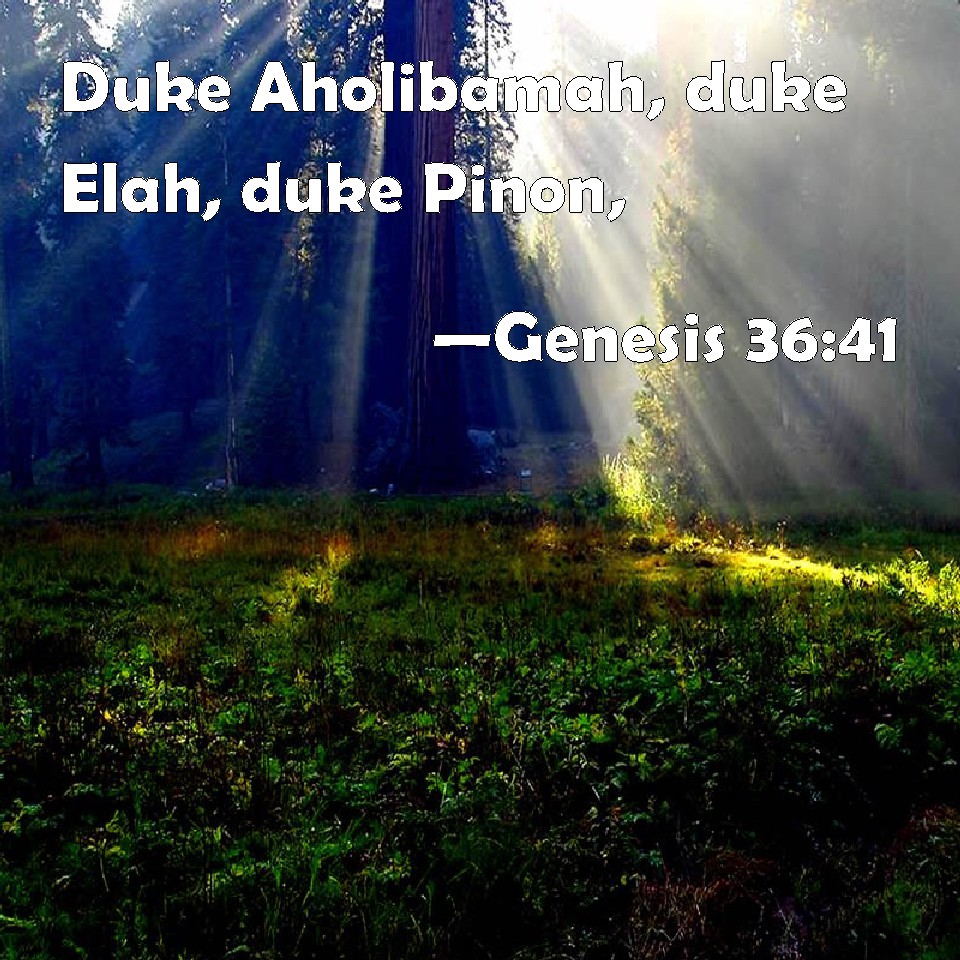 Choose a Background Genesis 36:41 Duke Aholibamah, duke Elah, duke Pinon, KJV: Duke Aholibamah, duke Elah, duke Pinon, DRB: Duke Oolibama, duke Ela, duke Phinon, DBT: chief Oholibamah, chief Elah, chief Pinon, ERV: duke Oholibamah, duke Elah, duke Pinon; WBT: Duke Aholibamah, duke Elah, duke Pinon, WEB: chief Oholibamah, chief Elah, chief Pinon, YLT: chief Aholibamah, chief Elah, chief Pinon,Links Genesis 36:41 NIV • Genesis 36:41 NLT • Genesis 36:41 ESV • Genesis 36:41 NASB • Genesis 36:41 KJV • Genesis 36:41 Interlinear • Genesis 36:41 Commentaries • Genesis 36:41 Parallel Texts • Genesis 36:41 Bible Apps • Genesis 36:41 Parallel • Bible Hub |
