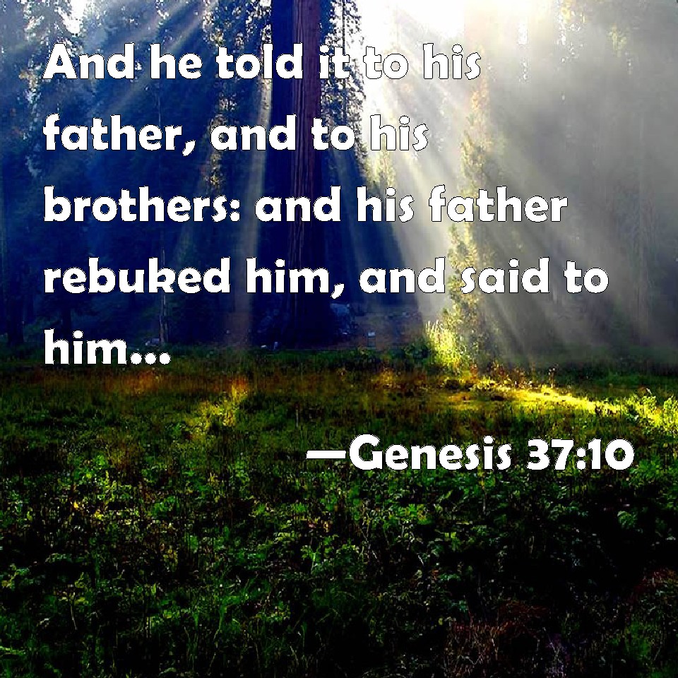 Choose a Background Genesis 37:10 And he told it to his father, and to his brothers: and his father rebuked him, and said to him, What is this dream that you have dreamed? Shall I and your mother and your brothers indeed come to bow down ourselves to you to the earth? KJV: And he told it to his father, and to his brethren: and his father rebuked him, and said unto him, What is this dream that thou hast dreamed? Shall I and thy mother and thy brethren indeed come to bow down ourselves to thee to the earth? DRB: And when he had told this to his father and brethren, his father rebuked him, and said: What meaneth this dream that thou hast dreamed? shall I and thy mother, and thy brethren worship thee upon the earth? DBT: And he told it to his father and to his brethren. And his father rebuked him, and said to him, What is this dream which thou hast dreamt? Shall we indeed come, I and thy mother and thy brethren, to bow down ourselves to thee to the earth? ERV: And he told it to his father, and to his brethren; and his father rebuked him, and said unto him, What is this dream that thou hast dreamed? Shall I and thy mother and thy brethren indeed come to bow down ourselves to thee to the earth? WBT: And he told it to his father, and to his brethren: and his father rebuked him, and said to him, what is this dream that thou hast dreamed? Shall I and thy mother and thy brethren indeed come to bow down ourselves to thee to the earth? WEB: He told it to his father and to his brothers. His father rebuked him, and said to him, "What is this dream that you have dreamed? Will I and your mother and your brothers indeed come to bow ourselves down to you to the earth?" YLT: And he recounteth unto his father, and unto his brethren; and his father pusheth against him, and saith to him, 'What is this dream which thou hast dreamt? do we certainly come — I, and thy mother, and thy brethren — to bow ourselves to thee, to the earth?'Links Genesis 37:10 NIV • Genesis 37:10 NLT • Genesis 37:10 ESV • Genesis 37:10 NASB • Genesis 37:10 KJV • Genesis 37:10 Interlinear • Genesis 37:10 Commentaries • Genesis 37:10 Parallel Texts • Genesis 37:10 Bible Apps • Genesis 37:10 Parallel • Bible Hub |