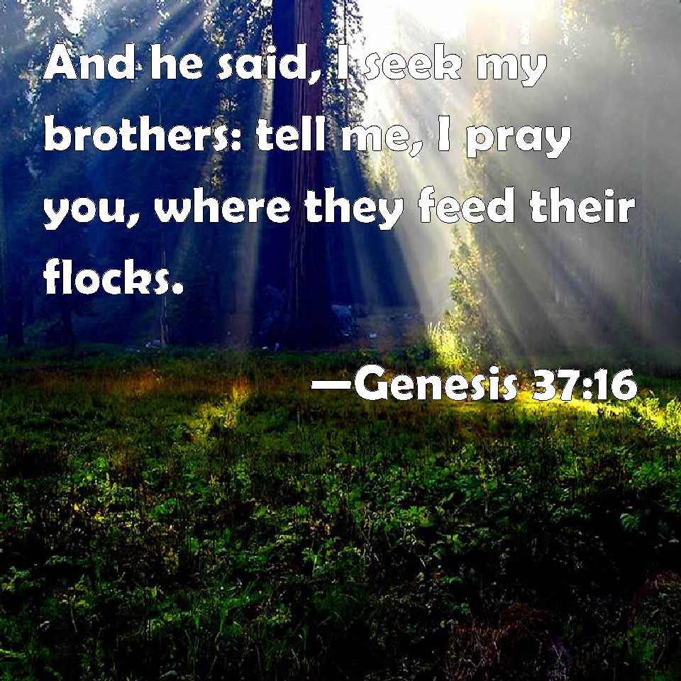 Choose a Background Genesis 37:16 And he said, I seek my brothers: tell me, I pray you, where they feed their flocks. KJV: And he said, I seek my brethren: tell me, I pray thee, where they feed their flocks. DRB: But he answered: I seek my brethren; tell me where they feed the docks. DBT: And he said, I am seeking my brethren: tell me, I pray thee, where they feed their flocks. ERV: And he said, I seek my brethren: tell me, I pray thee, where they are feeding the flock. WBT: And he said, I seek my brethren: tell me, I pray thee, where they feed their flocks. WEB: He said, "I am looking for my brothers. Tell me, please, where they are feeding the flock." YLT: and he saith, 'My brethren I am seeking, declare to me, I pray thee, where they are feeding?'Links Genesis 37:16 NIV • Genesis 37:16 NLT • Genesis 37:16 ESV • Genesis 37:16 NASB • Genesis 37:16 KJV • Genesis 37:16 Interlinear • Genesis 37:16 Commentaries • Genesis 37:16 Parallel Texts • Genesis 37:16 Bible Apps • Genesis 37:16 Parallel • Bible Hub |