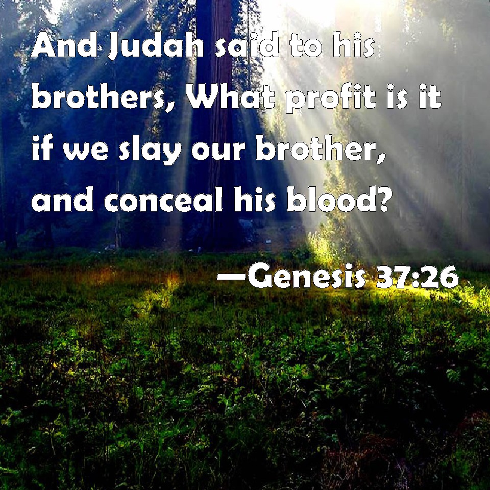Choose a Background Genesis 37:26 And Judah said to his brothers, What profit is it if we slay our brother, and conceal his blood? KJV: And Judah said unto his brethren, What profit is it if we slay our brother, and conceal his blood? DRB: And Juda said to his brethren: What will it profit us to kill our brother, and conceal his blood? DBT: And Judah said to his brethren, What profit is it that we kill our brother and secrete his blood? ERV: And Judah said unto his brethren, What profit is it if we slay our brother and conceal his blood? WBT: And Judah said to his brethren, What profit is it if we slay our brother, and conceal his blood. WEB: Judah said to his brothers, "What profit is it if we kill our brother and conceal his blood? YLT: And Judah saith unto his brethren, 'What gain when we slay our brother, and have concealed his blood?Links Genesis 37:26 NIV • Genesis 37:26 NLT • Genesis 37:26 ESV • Genesis 37:26 NASB • Genesis 37:26 KJV • Genesis 37:26 Interlinear • Genesis 37:26 Commentaries • Genesis 37:26 Parallel Texts • Genesis 37:26 Bible Apps • Genesis 37:26 Parallel • Bible Hub |