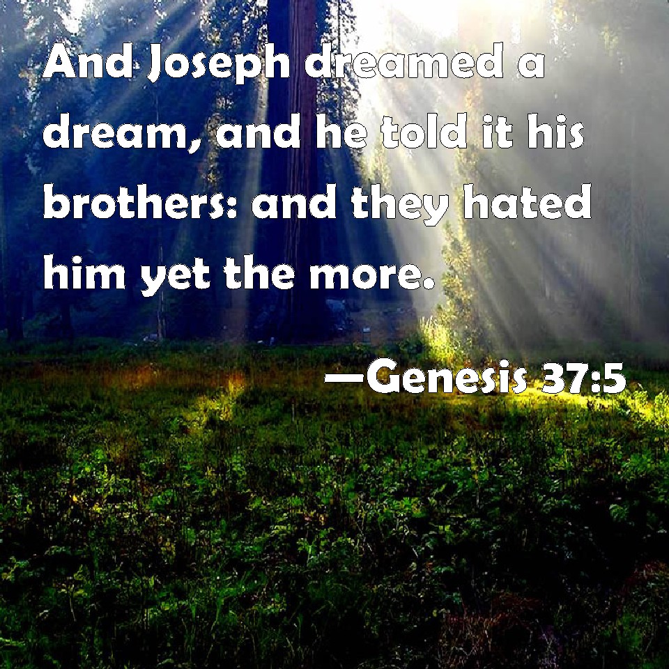 Choose a Background Genesis 37:5 And Joseph dreamed a dream, and he told it his brothers: and they hated him yet the more. KJV: And Joseph dreamed a dream, and he told it his brethren: and they hated him yet the more. DRB: Now it fell out also that he told his brethren a dream, that he had dreamed: which occasioned them to hate him the more. DBT: And Joseph dreamed a dream, and told it to his brethren, and they hated him yet the more. ERV: And Joseph dreamed a dream, and he told it to his brethren: and they hated him yet the more. WBT: And Joseph dreamed a dream, and he told it to his brethren: and they hated him yet the more. WEB: Joseph dreamed a dream, and he told it to his brothers, and they hated him all the more. YLT: And Joseph dreameth a dream, and declareth to his brethren, and they add still more to hate him.Links Genesis 37:5 NIV • Genesis 37:5 NLT • Genesis 37:5 ESV • Genesis 37:5 NASB • Genesis 37:5 KJV • Genesis 37:5 Interlinear • Genesis 37:5 Commentaries • Genesis 37:5 Parallel Texts • Genesis 37:5 Bible Apps • Genesis 37:5 Parallel • Bible Hub |