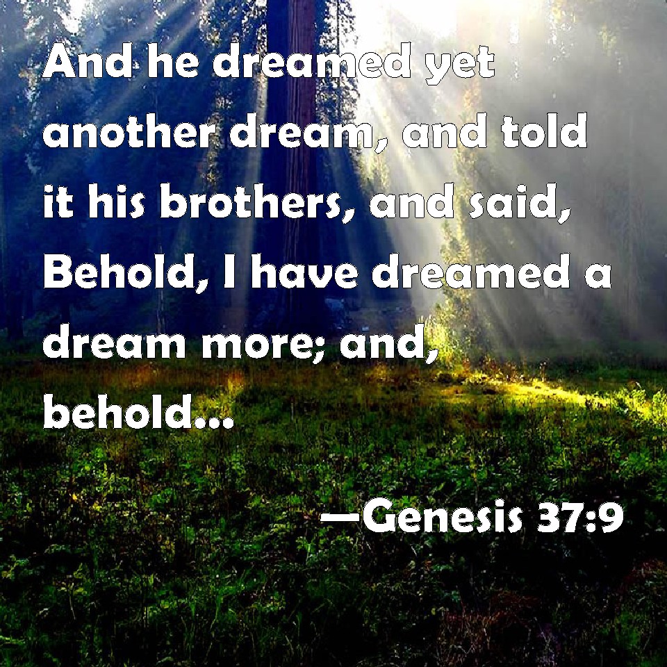 Choose a Background Genesis 37:9 And he dreamed yet another dream, and told it his brothers, and said, Behold, I have dreamed a dream more; and, behold, the sun and the moon and the eleven stars made obeisance to me. KJV: And he dreamed yet another dream, and told it his brethren, and said, Behold, I have dreamed a dream more; and, behold, the sun and the moon and the eleven stars made obeisance to me. DRB: He dreamed also another dream, which he told his brethren, saying: I saw in a dream, as it were the sun, and the moon, and eleven stars worshipping me. DBT: And he dreamed yet another dream, and told it to his brethren, and said, Behold, I have dreamt another dream, and behold, the sun and the moon and eleven stars bowed down to me. ERV: And he dreamed yet another dream, and told it to his brethren, and said, Behold, I have dreamed yet a dream; and, behold, the sun and the moon and eleven stars made obeisance to me. WBT: And he dreamed yet another dream, and told it to his brethren, and said, Behold, I have dreamed a dream more: and behold, the sun and the moon and the eleven stars made obeisance to me. WEB: He dreamed yet another dream, and told it to his brothers, and said, "Behold, I have dreamed yet another dream: and behold, the sun and the moon and eleven stars bowed down to me." YLT: And he dreameth yet another dream, and recounteth it to his brethren, and saith, 'Lo, I have dreamed a dream again, and lo, the sun and the moon, and eleven stars, are bowing themselves to me.'Links Genesis 37:9 NIV • Genesis 37:9 NLT • Genesis 37:9 ESV • Genesis 37:9 NASB • Genesis 37:9 KJV • Genesis 37:9 Interlinear • Genesis 37:9 Commentaries • Genesis 37:9 Parallel Texts • Genesis 37:9 Bible Apps • Genesis 37:9 Parallel • Bible Hub |