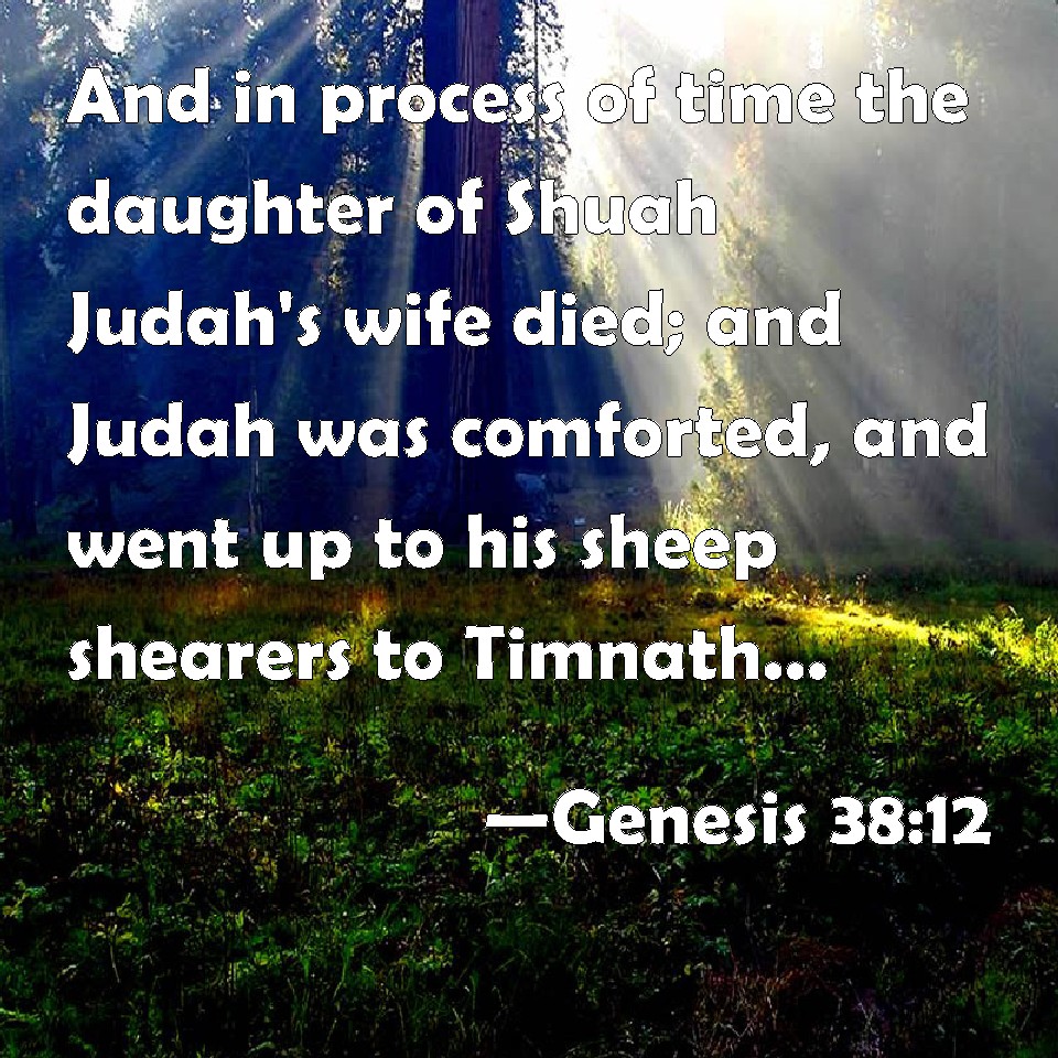 Choose a Background Genesis 38:12 And in process of time the daughter of Shuah Judah's wife died; and Judah was comforted, and went up to his sheep shearers to Timnath, he and his friend Hirah the Adullamite. KJV: And in process of time the daughter of Shuah Judah's wife died; and Judah was comforted, and went up unto his sheepshearers to Timnath, he and his friend Hirah the Adullamite. DRB: And after many days were past, the daughter of Sue the wife of Juda died: and when he had taken comfort after his mourning, he went up to Thamnas, to the shearers of his sheep, he and Hiras the Odollamite the shepherd of his flock. DBT: And as the days were multiplied, Judah's wife, the daughter of Shua, died. And Judah was comforted, and he went up to his sheep-shearers, to Timnah, he and his friend Hirah the Adullamite. ERV: And in process of time Shua's daughter, the wife of Judah, died; and Judah was comforted, and went up unto his sheepshearers to Timnah, he and his friend Hirah the Adullamite. WBT: And in process of time, the daughter of Shuah Judah's wife died: and Judah was comforted, and went up to his sheep-shearers to Timnath, he and his friend Hirah the Adullamite. WEB: After many days, Shua's daughter, the wife of Judah, died. Judah was comforted, and went up to his sheepshearers to Timnah, he and his friend Hirah, the Adullamite. YLT: And the days are multiplied, and the daughter of Shuah, Judah's wife, dieth; and Judah is comforted, and goeth up unto his sheep-shearers, he and Hirah his friend the Adullamite, to Timnath.Links Genesis 38:12 NIV • Genesis 38:12 NLT • Genesis 38:12 ESV • Genesis 38:12 NASB • Genesis 38:12 KJV • Genesis 38:12 Interlinear • Genesis 38:12 Commentaries • Genesis 38:12 Parallel Texts • Genesis 38:12 Bible Apps • Genesis 38:12 Parallel • Bible Hub |