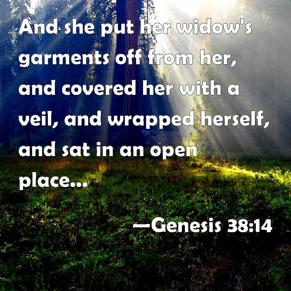 Genesis 38:14 And she put her widow's garments off from her, and covered her with a veil, and wrapped herself, and sat in an open place, which is by the way to Timnath; for she saw that Shelah was grown, and she was not given to him to wife.