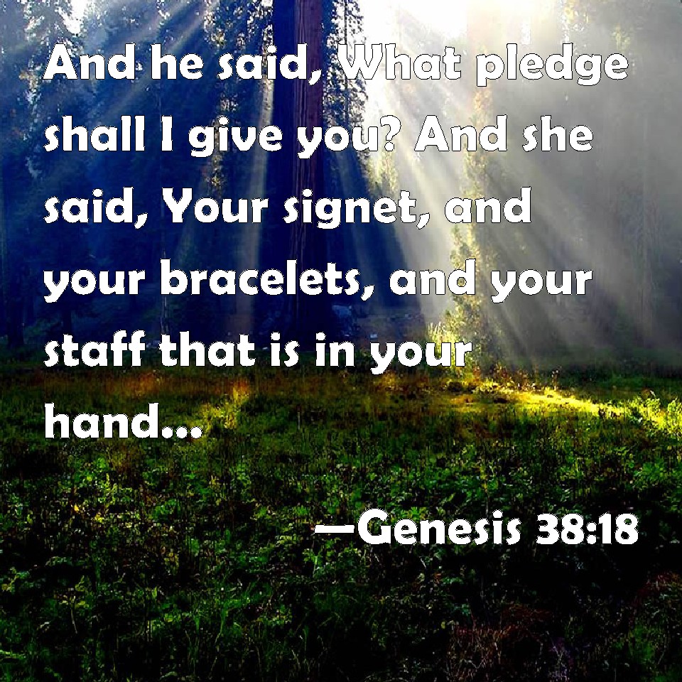 Choose a Background Genesis 38:18 And he said, What pledge shall I give you? And she said, Your signet, and your bracelets, and your staff that is in your hand. And he gave it her, and came in to her, and she conceived by him. KJV: And he said, What pledge shall I give thee? And she said, Thy signet, and thy bracelets, and thy staff that is in thine hand. And he gave it her, and came in unto her, and she conceived by him. DRB: Juda said: What wilt thou have for a pledge ? She answered: Thy ring and bracelet, and the staff which thou holdest in thy hand. The woman therefore at one copulation conceived. DBT: And he said, What pledge shall I give thee? And she said, Thy signet, and thy lace, and thy staff which is in thy hand. And he gave it her, and went in to her; and she conceived by him. ERV: And he said, What pledge shall I give thee? And she said, Thy signet and thy cord, and thy staff that is in thine hand. And he gave them to her, and came in unto her, and she conceived by him. WBT: And he said, What pledge shall I give thee? and she said, Thy signet, and thy bracelets, and thy staff that is in thy hand: and he gave them to her, and came in to her, and she conceived by him. WEB: He said, "What pledge will I give you?" She said, "Your signet and your cord, and your staff that is in your hand." He gave them to her, and came in to her, and she conceived by him. YLT: and he saith, 'What is the pledge that I give to thee?' and she saith, 'Thy seal, and thy ribbon, and thy staff which is in thy hand;' and he giveth to her, and goeth in unto her, and she conceiveth to him;Links Genesis 38:18 NIV • Genesis 38:18 NLT • Genesis 38:18 ESV • Genesis 38:18 NASB • Genesis 38:18 KJV • Genesis 38:18 Interlinear • Genesis 38:18 Commentaries • Genesis 38:18 Parallel Texts • Genesis 38:18 Bible Apps • Genesis 38:18 Parallel • Bible Hub |