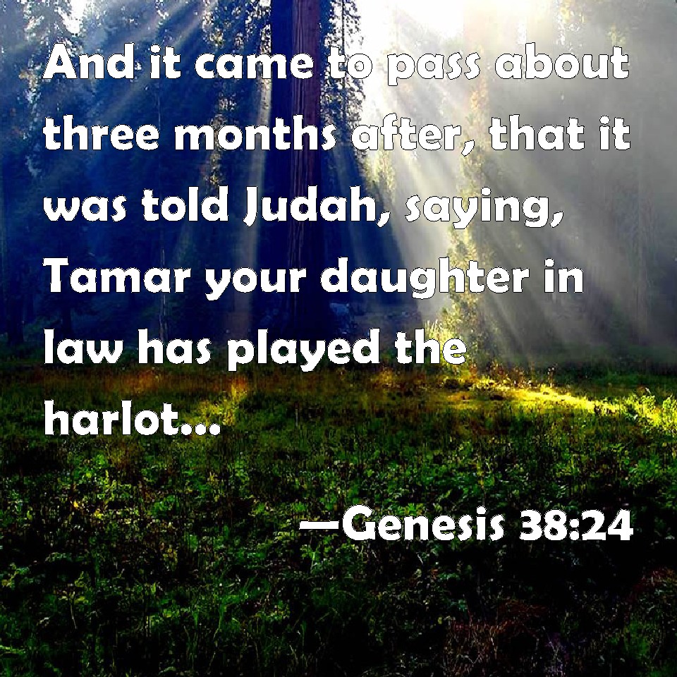 Choose a Background Genesis 38:24 And it came to pass about three months after, that it was told Judah, saying, Tamar your daughter in law has played the harlot; and also, behold, she is with child by prostitution. And Judah said, Bring her forth, and let her be burnt. KJV: And it came to pass about three months after, that it was told Judah, saying, Tamar thy daughter in law hath played the harlot; and also, behold, she is with child by whoredom. And Judah said, Bring her forth, and let her be burnt. DRB: And behold after three months they told a lie, saying: Thamar, thy daughter in law hath played the harlot, and she appeareth to have a big belly. And Juda said : Bring her out that she may be burnt. DBT: And it came to pass about three months after, that it was told Judah, saying, Tamar thy daughter-in-law has committed fornication, and behold, she is also with child by fornication. And Judah said, Bring her forth, that she may be burned. ERV: And it came to pass about three months after, that it was told Judah, saying, Tamar thy daughter in law hath played the harlot; and moreover, behold, she is with child by whoredom. And Judah said, Bring her forth, and let her be burnt. WBT: And it came to pass about three months after, that it was told to Judah, saying, Tamar thy daughter-in-law hath played the harlot; and also, behold she is with child by lewdness: and Judah said, Bring her forth, and let her be burnt. WEB: It happened about three months later, that it was told Judah, saying, "Tamar, your daughter-in-law, has played the prostitute; and moreover, behold, she is with child by prostitution." Judah said, "Bring her forth, and let her be burnt." YLT: And it cometh to pass about three months after, that it is declared to Judah, saying, 'Tamar thy daughter-in-law hath committed fornication; and also, lo, she hath conceived by fornication:' and Judah saith, 'Bring her out — and she is burnt.'Links Genesis 38:24 NIV • Genesis 38:24 NLT • Genesis 38:24 ESV • Genesis 38:24 NASB • Genesis 38:24 KJV • Genesis 38:24 Interlinear • Genesis 38:24 Commentaries • Genesis 38:24 Parallel Texts • Genesis 38:24 Bible Apps • Genesis 38:24 Parallel • Bible Hub |