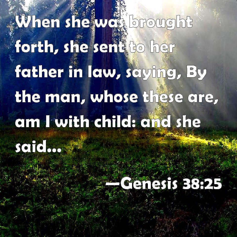 KJV:  When she was brought forth, she sent to her father in law, saying, By the man, whose these are, am I with child: and she said, Discern, I pray thee, whose are these, the signet, and bracelets, and staff.