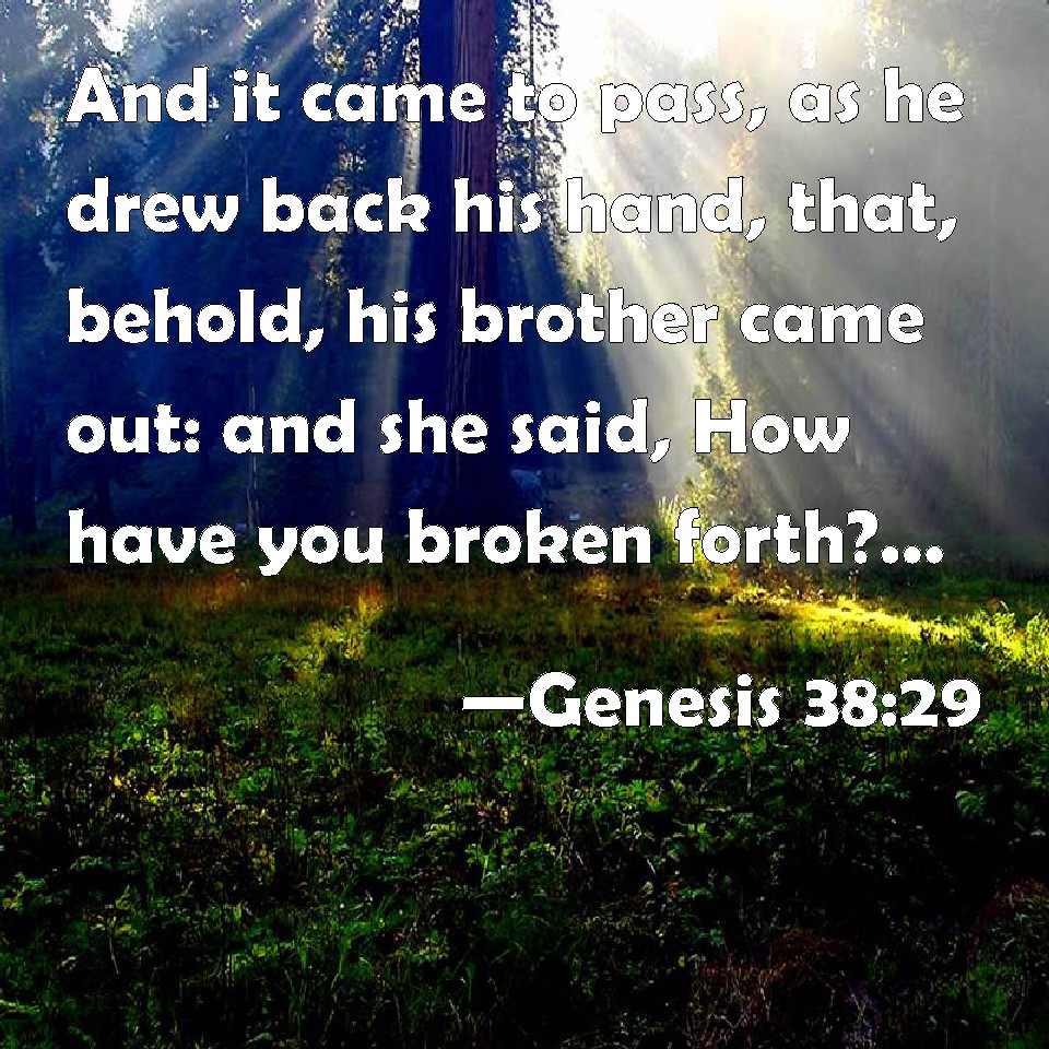 Choose a Background Genesis 38:29 And it came to pass, as he drew back his hand, that, behold, his brother came out: and she said, How have you broken forth? this breach be on you: therefore his name was called Pharez. KJV: And it came to pass, as he drew back his hand, that, behold, his brother came out: and she said, How hast thou broken forth? this breach be upon thee: therefore his name was called Pharez. DRB: But he drawing back his hand, the other came forth: and the woman said: Why is the partition divided for thee? and therefore called his name Phares. DBT: And it came to pass as he drew back his hand, that behold, his brother came out; and she said, How hast thou broken forth! on thee be the breach! And they called his name Pherez. ERV: And it came to pass, as he drew back his hand, that, behold, his brother came out: and she said, Wherefore hast thou made a breach for thyself? therefore his name was called Perez. WBT: And it came to pass as he drew back his hand, that behold, his brother came out; and she said, How hast thou broken forth? this breach be upon thee: therefore his name was called Pharez. WEB: It happened, as he drew back his hand, that behold, his brother came out, and she said, "Why have you made a breach for yourself?" Therefore his name was called Perez. YLT: And it cometh to pass as he draweth back his hand, that lo, his brother hath come out, and she saith, 'What! thou hast broken forth — on thee is the breach;' and he calleth his name Pharez;Links Genesis 38:29 NIV • Genesis 38:29 NLT • Genesis 38:29 ESV • Genesis 38:29 NASB • Genesis 38:29 KJV • Genesis 38:29 Interlinear • Genesis 38:29 Commentaries • Genesis 38:29 Parallel Texts • Genesis 38:29 Bible Apps • Genesis 38:29 Parallel • Bible Hub |