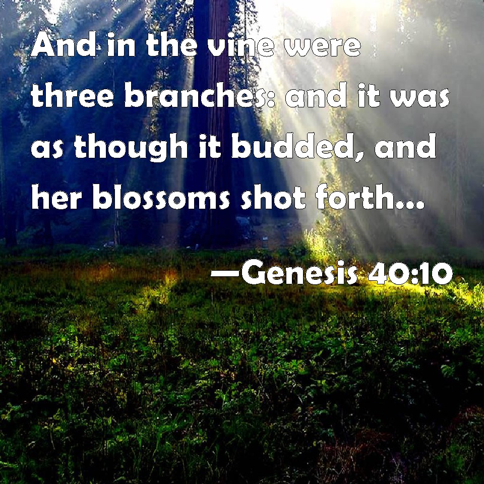 Choose a Background Genesis 40:10 And in the vine were three branches: and it was as though it budded, and her blossoms shot forth; and the clusters thereof brought forth ripe grapes: KJV: And in the vine were three branches: and it was as though it budded, and her blossoms shot forth; and the clusters thereof brought forth ripe grapes: DRB: On which were three branches, which by little and little sent out buds, and after the blossoms brought forth ripe grapes : DBT: and in the vine were three branches; and it was as though it budded: its blossoms shot forth, its clusters ripened into grapes. ERV: and in the vine were three branches: and it was as though it budded, and its blossoms shot forth; and the clusters thereof brought forth ripe grapes: WBT: And on the vine were three branches: and it was as though it budded, and its blossoms shot forth; and its clusters brought forth ripe grapes: WEB: and in the vine were three branches. It was as though it budded, its blossoms shot forth, and its clusters brought forth ripe grapes. YLT: and in the vine are three branches, and it is as it were flourishing; gone up hath its blossom, its clusters have ripened grapes;Links Genesis 40:10 NIV • Genesis 40:10 NLT • Genesis 40:10 ESV • Genesis 40:10 NASB • Genesis 40:10 KJV • Genesis 40:10 Interlinear • Genesis 40:10 Commentaries • Genesis 40:10 Parallel Texts • Genesis 40:10 Bible Apps • Genesis 40:10 Parallel • Bible Hub |