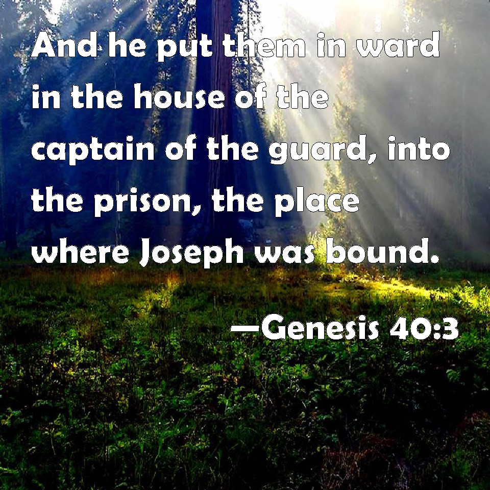 Choose a Background Genesis 40:3 And he put them in ward in the house of the captain of the guard, into the prison, the place where Joseph was bound. KJV: And he put them in ward in the house of the captain of the guard, into the prison, the place where Joseph was bound. DRB: He sent them to the prison of the commander of the soldiers, in which Joseph also was prisoner, DBT: and he put them in custody into the house of the captain of the life-guard, into the tower-house, into the place where Joseph was imprisoned. ERV: And he put them in ward in the house of the captain of the guard, into the prison, the place where Joseph was bound. WBT: And he put them in custody in the house of the captain of the guard, into the prison, the place where Joseph was bound. WEB: He put them in custody in the house of the captain of the guard, into the prison, the place where Joseph was bound. YLT: and giveth them in charge in the house of the chief of the executioners, unto the round-house, the place where Joseph is a prisoner,Links Genesis 40:3 NIV • Genesis 40:3 NLT • Genesis 40:3 ESV • Genesis 40:3 NASB • Genesis 40:3 KJV • Genesis 40:3 Interlinear • Genesis 40:3 Commentaries • Genesis 40:3 Parallel Texts • Genesis 40:3 Bible Apps • Genesis 40:3 Parallel • Bible Hub |