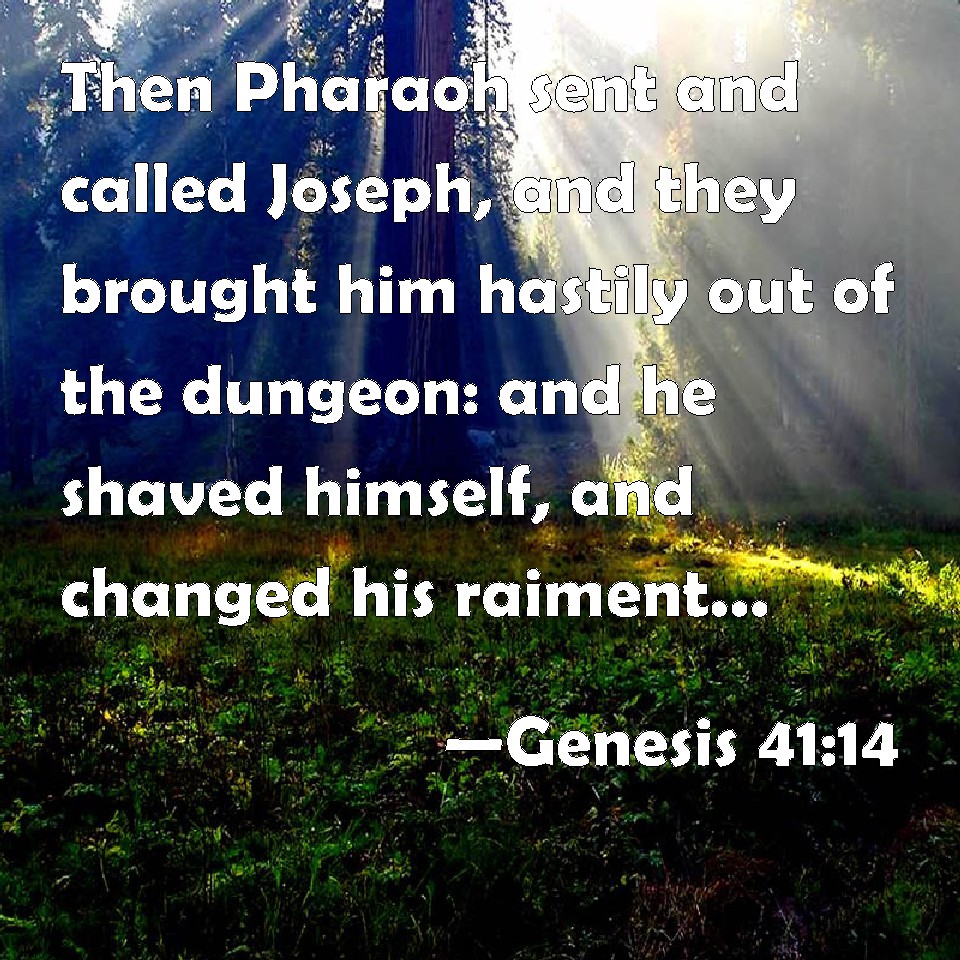 Choose a Background Genesis 41:14 Then Pharaoh sent and called Joseph, and they brought him hastily out of the dungeon: and he shaved himself, and changed his raiment, and came in to Pharaoh. KJV: Then Pharaoh sent and called Joseph, and they brought him hastily out of the dungeon: and he shaved himself, and changed his raiment, and came in unto Pharaoh. DRB: Forthwith at the king's command, Joseph was brought out of the prison, and they shaved him, and changing his apparel, brought him in to him. DBT: Then Pharaoh sent and called Joseph; and they brought him hastily out of the dungeon. And he shaved himself, and changed his clothes, and came in to Pharaoh. ERV: Then Pharaoh sent and called Joseph, and they brought him hastily out of the dungeon: and he shaved himself, and changed his raiment, and came in unto Pharaoh. WBT: Then Pharaoh sent and called Joseph, and they brought him hastily out of the dungeon: and he shaved himself, and changed his raiment, and came before Pharaoh. WEB: Then Pharaoh sent and called Joseph, and they brought him hastily out of the dungeon. He shaved himself, changed his clothing, and came in to Pharaoh. YLT: And Pharaoh sendeth and calleth Joseph, and they cause him to run out of the pit, and he shaveth, and changeth his garments, and cometh in unto Pharaoh.Links Genesis 41:14 NIV • Genesis 41:14 NLT • Genesis 41:14 ESV • Genesis 41:14 NASB • Genesis 41:14 KJV • Genesis 41:14 Interlinear • Genesis 41:14 Commentaries • Genesis 41:14 Parallel Texts • Genesis 41:14 Bible Apps • Genesis 41:14 Parallel • Bible Hub |
