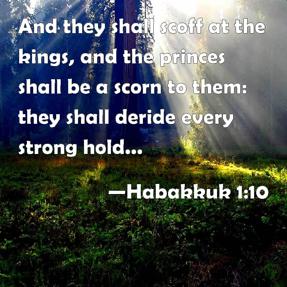 Choose a Background Habakkuk 1:10 And they shall scoff at the kings, and the princes shall be a scorn to them: they shall deride every strong hold; for they shall heap dust, and take it. KJV: And they shall scoff at the kings, and the princes shall be a scorn unto them: they shall deride every strong hold; for they shall heap dust, and take it. DRB: And their prince shall triumph over kings, and princes shall be his laughingstock: and he shall laugh at every strong hold, and shall cast up a mount, and shall take it. DBT: Yea, he scoffeth at kings, and princes are a scorn unto him; he derideth every stronghold: for he heapeth up dust, and taketh it. ERV: Yea, he scoffeth at kings, and princes are a derision unto him: he derideth every strong hold; for he heapeth up dust, and taketh it. WBT: And they shall scoff at the kings, and the princes shall be a scorn to them: they shall deride every strong hold; for they shall heap dust, and take it. WEB: Yes, he scoffs at kings, and princes are a derision to him. He laughs at every stronghold, for he builds up an earthen ramp, and takes it. YLT: And at kings it doth scoff, And princes are a laughter to it, At every fenced place it doth laugh, And it heapeth up dust, and captureth it.Links Habakkuk 1:10 NIV • Habakkuk 1:10 NLT • Habakkuk 1:10 ESV • Habakkuk 1:10 NASB • Habakkuk 1:10 KJV • Habakkuk 1:10 Interlinear • Habakkuk 1:10 Commentaries • Habakkuk 1:10 Parallel Texts • Habakkuk 1:10 Bible Apps • Habakkuk 1:10 Parallel • Bible Hub |