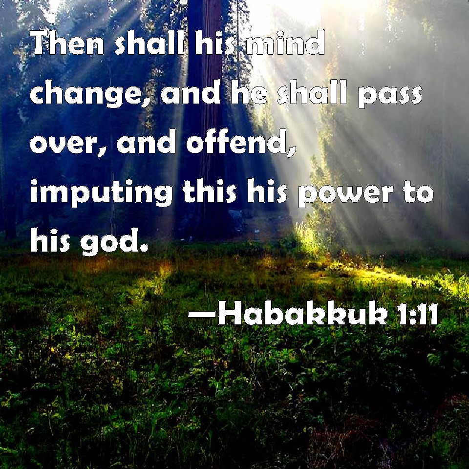 Choose a Background Habakkuk 1:11 Then shall his mind change, and he shall pass over, and offend, imputing this his power to his god. KJV: Then shall his mind change, and he shall pass over, and offend, imputing this his power unto his god. DRB: Then shall his spirit be changed, and he shall pass, and fall: this is his strength of his god. DBT: Then will his mind change, and he will pass on, and become guilty: this his power is become his +god. ERV: Then shall he sweep by as a wind, and shall pass over, and be guilty: even he whose might is his god. WBT: Then shall his mind change, and he shall pass over, and offend, imputing this his power to his god. WEB: Then he sweeps by like the wind, and goes on. He is indeed guilty, whose strength is his god." YLT: Then passed on hath the spirit, Yea, he doth transgress, And doth ascribe this his power to his god.Links Habakkuk 1:11 NIV • Habakkuk 1:11 NLT • Habakkuk 1:11 ESV • Habakkuk 1:11 NASB • Habakkuk 1:11 KJV • Habakkuk 1:11 Interlinear • Habakkuk 1:11 Commentaries • Habakkuk 1:11 Parallel Texts • Habakkuk 1:11 Bible Apps • Habakkuk 1:11 Parallel • Bible Hub |