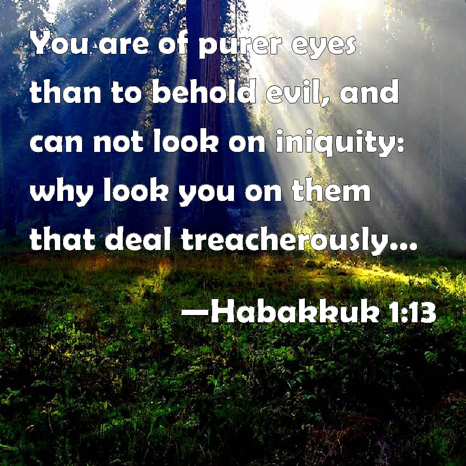 Choose a Background Habakkuk 1:13 You are of purer eyes than to behold evil, and can not look on iniquity: why look you on them that deal treacherously, and hold your tongue when the wicked devours the man that is more righteous than he? KJV: Thou art of purer eyes than to behold evil, and canst not look on iniquity: wherefore lookest thou upon them that deal treacherously, and holdest thy tongue when the wicked devoureth the man that is more righteous than he? DRB: Thy eyes are too pure to behold evil, and thou canst not look on iniquity. Why lookest thou upon them that do unjust things, and holdest thy peace when the wicked devoureth the man that is more just than himself? DBT: Thou art of purer eyes than to behold evil, and canst not look on mischief: wherefore lookest thou upon them that deal treacherously, and keepest silence when the wicked swalloweth up a man more righteous than he? ERV: Thou that art of purer eyes than to behold evil, and that canst not look on perverseness, wherefore lookest thou upon them that deal treacherously, and holdest thy peace when the wicked swalloweth up the man that is more righteous than he; WBT: Thou art of purer eyes than to behold evil, and canst not look on iniquity: why lookest thou on them that deal treacherously, and keepest silence when the wicked devoureth the man that is more righteous than he? WEB: You who have purer eyes than to see evil, and who cannot look on perversity, why do you tolerate those who deal treacherously, and keep silent when the wicked swallows up the man who is more righteous than he, YLT: Purer of eyes than to behold evil, To look on perverseness Thou art not able, Why dost Thou behold the treacherous? Thou keepest silent when the wicked Doth swallow the more righteous than he,Links Habakkuk 1:13 NIV • Habakkuk 1:13 NLT • Habakkuk 1:13 ESV • Habakkuk 1:13 NASB • Habakkuk 1:13 KJV • Habakkuk 1:13 Interlinear • Habakkuk 1:13 Commentaries • Habakkuk 1:13 Parallel Texts • Habakkuk 1:13 Bible Apps • Habakkuk 1:13 Parallel • Bible Hub |