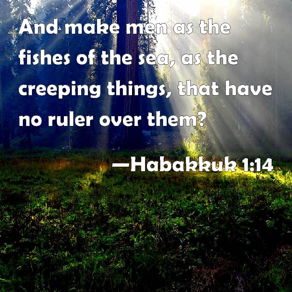 Choose a Background Habakkuk 1:14 And make men as the fishes of the sea, as the creeping things, that have no ruler over them? KJV: And makest men as the fishes of the sea, as the creeping things, that have no ruler over them? DRB: And thou wilt make men as the fishes of the sea, and as the creeping things that have no ruler. DBT: And thou makest men as the fishes of the sea, as the creeping things, that have no ruler over them. ERV: and makest men as the fishes of the sea, as the creeping things, that have no ruler over them? WBT: And makest men as the fishes of the sea, as the creeping animals that have no ruler over them? WEB: and make men like the fish of the sea, like the creeping things, that have no ruler over them? YLT: And Thou makest man as fishes of the sea, As a creeping thing — none ruling over him.Links Habakkuk 1:14 NIV • Habakkuk 1:14 NLT • Habakkuk 1:14 ESV • Habakkuk 1:14 NASB • Habakkuk 1:14 KJV • Habakkuk 1:14 Interlinear • Habakkuk 1:14 Commentaries • Habakkuk 1:14 Parallel Texts • Habakkuk 1:14 Bible Apps • Habakkuk 1:14 Parallel • Bible Hub |