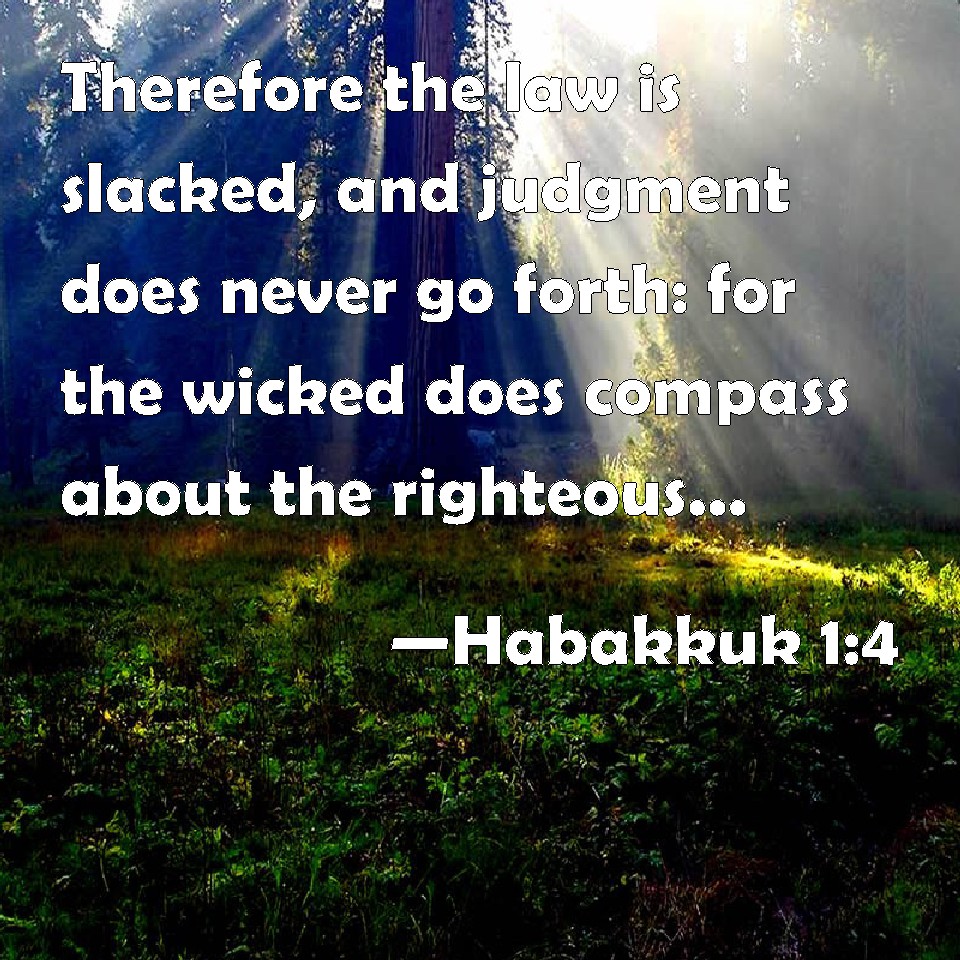 Choose a Background Habakkuk 1:4 Therefore the law is slacked, and judgment does never go forth: for the wicked does compass about the righteous; therefore wrong judgment proceeds. KJV: Therefore the law is slacked, and judgment doth never go forth: for the wicked doth compass about the righteous; therefore wrong judgment proceedeth. DRB: Therefore the law is torn in pieces, and judgment cometh not to the end: because the wicked prevaileth against the just, therefore wrong judgment goeth forth. DBT: Therefore the law is powerless, and justice doth never go forth; for the wicked encompasseth the righteous; therefore judgment goeth forth perverted. ERV: Therefore the law is slacked, and judgment doth never go forth: for the wicked doth compass about the righteous; therefore judgment goeth forth perverted. WBT: Therefore the law is slackened, and judgment doth never go forth: for the wicked doth encompass the righteous; therefore wrong judgment proceedeth. WEB: Therefore the law is paralyzed, and justice never goes forth; for the wicked surround the righteous; therefore justice goes forth perverted. YLT: Therefore doth law cease, And judgment doth not go forth for ever, For the wicked is compassing the righteous, Therefore wrong judgment goeth forth.Links Habakkuk 1:4 NIV • Habakkuk 1:4 NLT • Habakkuk 1:4 ESV • Habakkuk 1:4 NASB • Habakkuk 1:4 KJV • Habakkuk 1:4 Interlinear • Habakkuk 1:4 Commentaries • Habakkuk 1:4 Parallel Texts • Habakkuk 1:4 Bible Apps • Habakkuk 1:4 Parallel • Bible Hub |