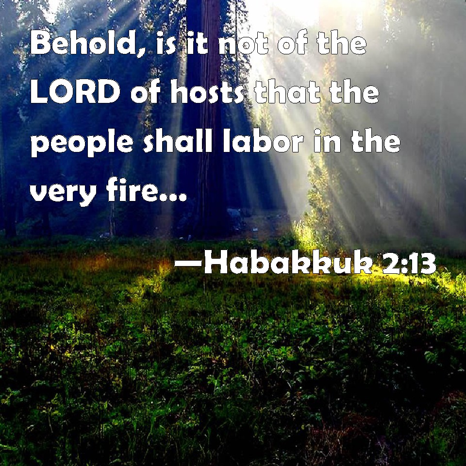 Choose a Background Habakkuk 2:13 Behold, is it not of the LORD of hosts that the people shall labor in the very fire, and the people shall weary themselves for very vanity? KJV: Behold, is it not of the LORD of hosts that the people shall labour in the very fire, and the people shall weary themselves for very vanity? DRB: Are not these things from the Lord of hosts? for the people shall labour in a great fire: and the nations in vain, and they shall faint. DBT: Behold, is it not of Jehovah of hosts that the peoples labour for the fire, and the nations weary themselves in vain? ERV: Behold, is it not of the LORD of hosts that the peoples labour for the fire, and the nations weary themselves for vanity? WBT: Behold, is it not from the LORD of hosts that the people shall labor in the very fire, and the people shall weary themselves for very vanity? WEB: Behold, isn't it of Yahweh of Armies that the peoples labor for the fire, and the nations weary themselves for vanity? YLT: Lo, is it not from Jehovah of Hosts And peoples are fatigued for fire, And nations for vanity are weary?Links Habakkuk 2:13 NIV • Habakkuk 2:13 NLT • Habakkuk 2:13 ESV • Habakkuk 2:13 NASB • Habakkuk 2:13 KJV • Habakkuk 2:13 Interlinear • Habakkuk 2:13 Commentaries • Habakkuk 2:13 Parallel Texts • Habakkuk 2:13 Bible Apps • Habakkuk 2:13 Parallel • Bible Hub |