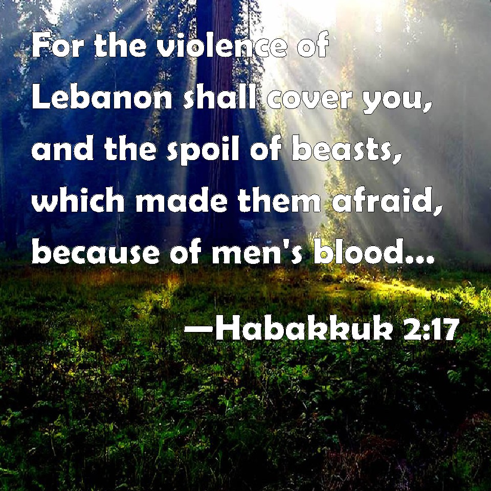 Choose a Background Habakkuk 2:17 For the violence of Lebanon shall cover you, and the spoil of beasts, which made them afraid, because of men's blood, and for the violence of the land, of the city, and of all that dwell therein. KJV: For the violence of Lebanon shall cover thee, and the spoil of beasts, which made them afraid, because of men's blood, and for the violence of the land, of the city, and of all that dwell therein. DRB: For the iniquity of Libanus shall cover thee, and the ravaging of beasts shall terrify them because of the blood of men, and the iniquity of the land, and of the city, and of all that dwell therein. DBT: For the violence done to Lebanon shall cover thee, and the destruction of beasts which made them afraid; because of men's blood, and for the violence done to the land, to the city, and all that dwell therein. ERV: For the violence done to Lebanon shall cover thee, and the destruction of the beasts, which made them afraid; because of men's blood, and for the violence done to the land, to the city and to all that dwell therein. WBT: For the violence of Lebanon shall cover thee, and the spoil of beasts, which made them afraid, because of men's blood, and for the violence of the land, of the city, and of all that dwell therein. WEB: For the violence done to Lebanon will overwhelm you, and the destruction of the animals, which made them afraid; because of men's blood, and for the violence done to the land, to every city and to those who dwell in them. YLT: For violence to Lebanon doth cover thee, And spoil of beasts doth affright them, Because of man's blood, and of violence to the land, To the city, and to all dwelling in it.Links Habakkuk 2:17 NIV • Habakkuk 2:17 NLT • Habakkuk 2:17 ESV • Habakkuk 2:17 NASB • Habakkuk 2:17 KJV • Habakkuk 2:17 Interlinear • Habakkuk 2:17 Commentaries • Habakkuk 2:17 Parallel Texts • Habakkuk 2:17 Bible Apps • Habakkuk 2:17 Parallel • Bible Hub |